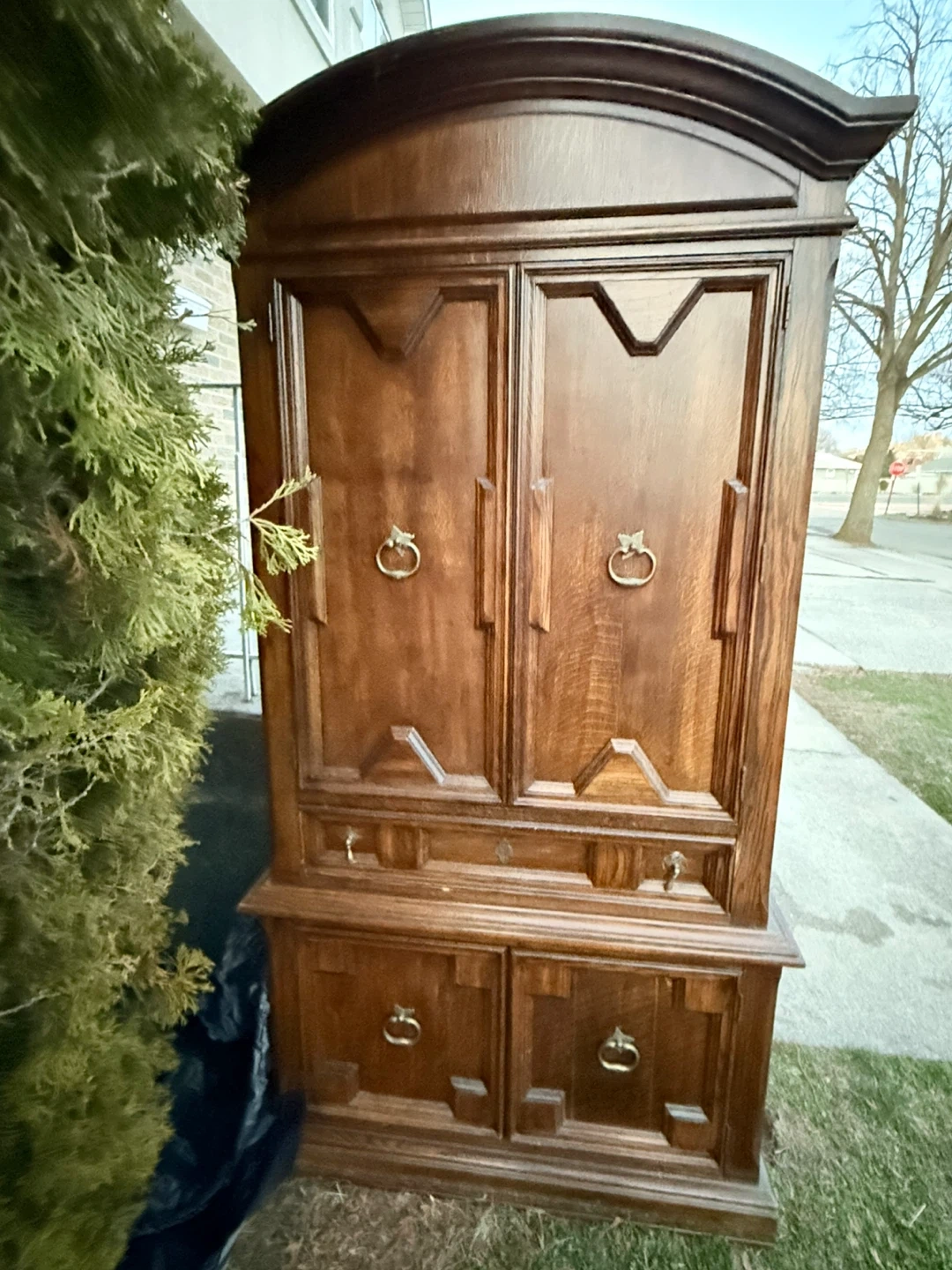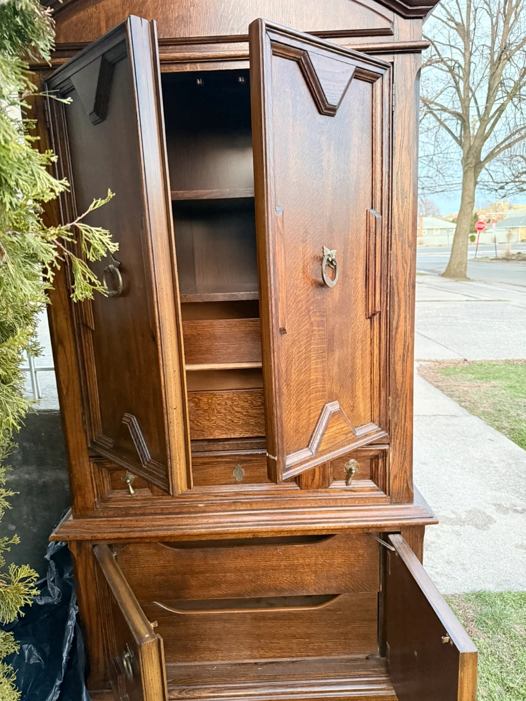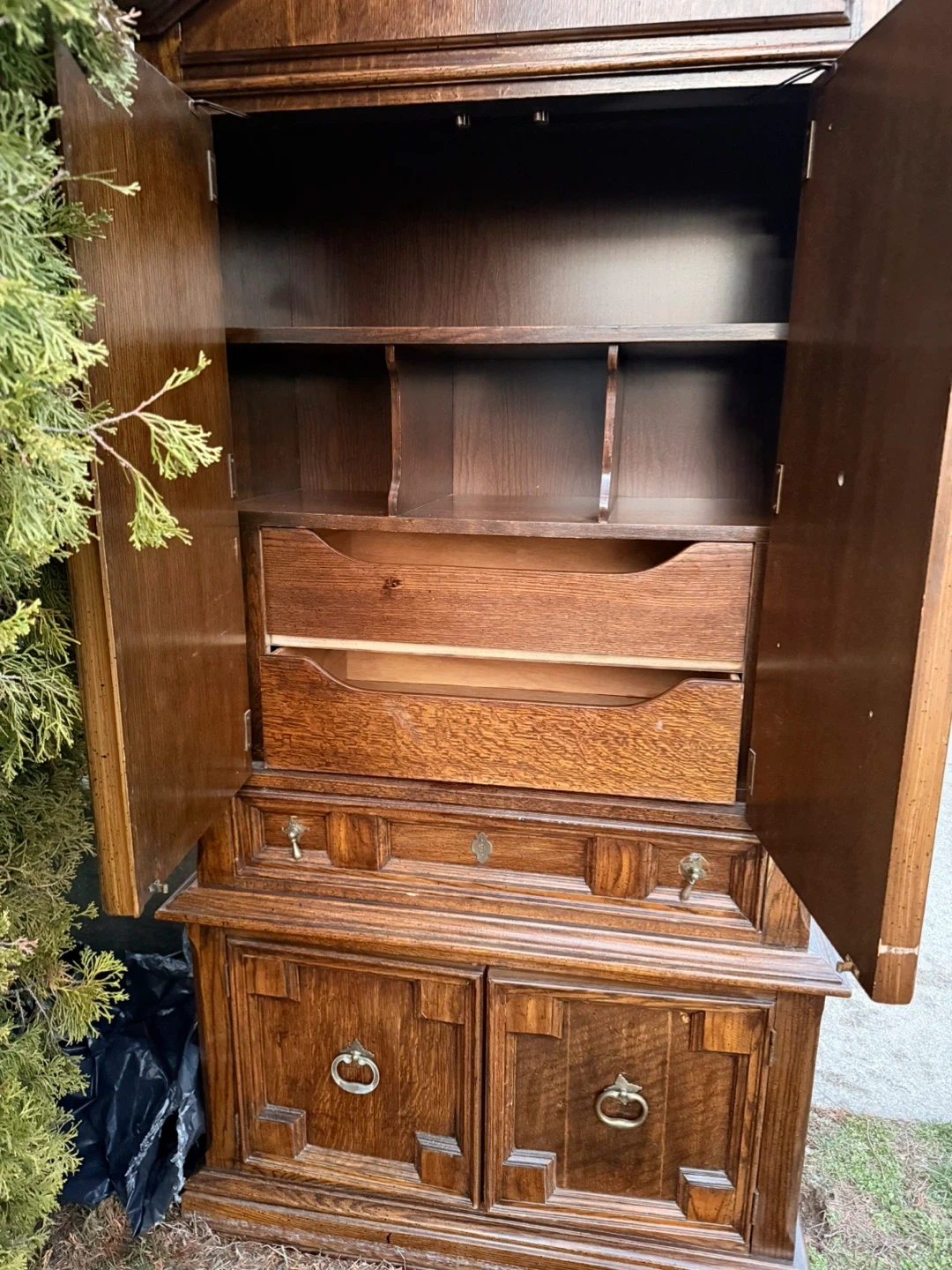 This beautiful armoire is crafted from solid oak with a rich, dark stain. It features two large doors on top, with several shelves and drawers inside. The bottom section has two more doors and drawers for ample storage. It's a sturdy piece with classic detailing and ring pulls.