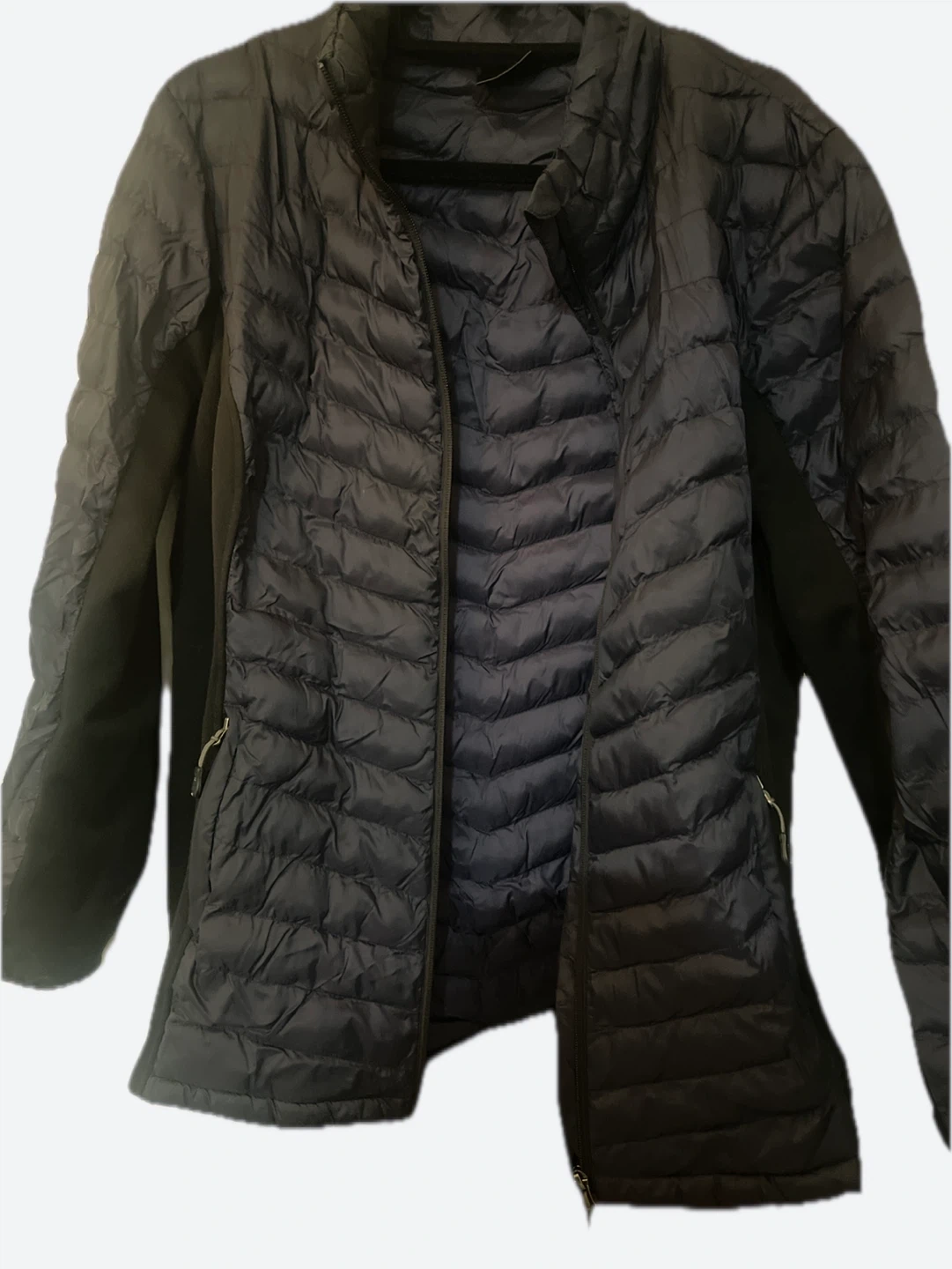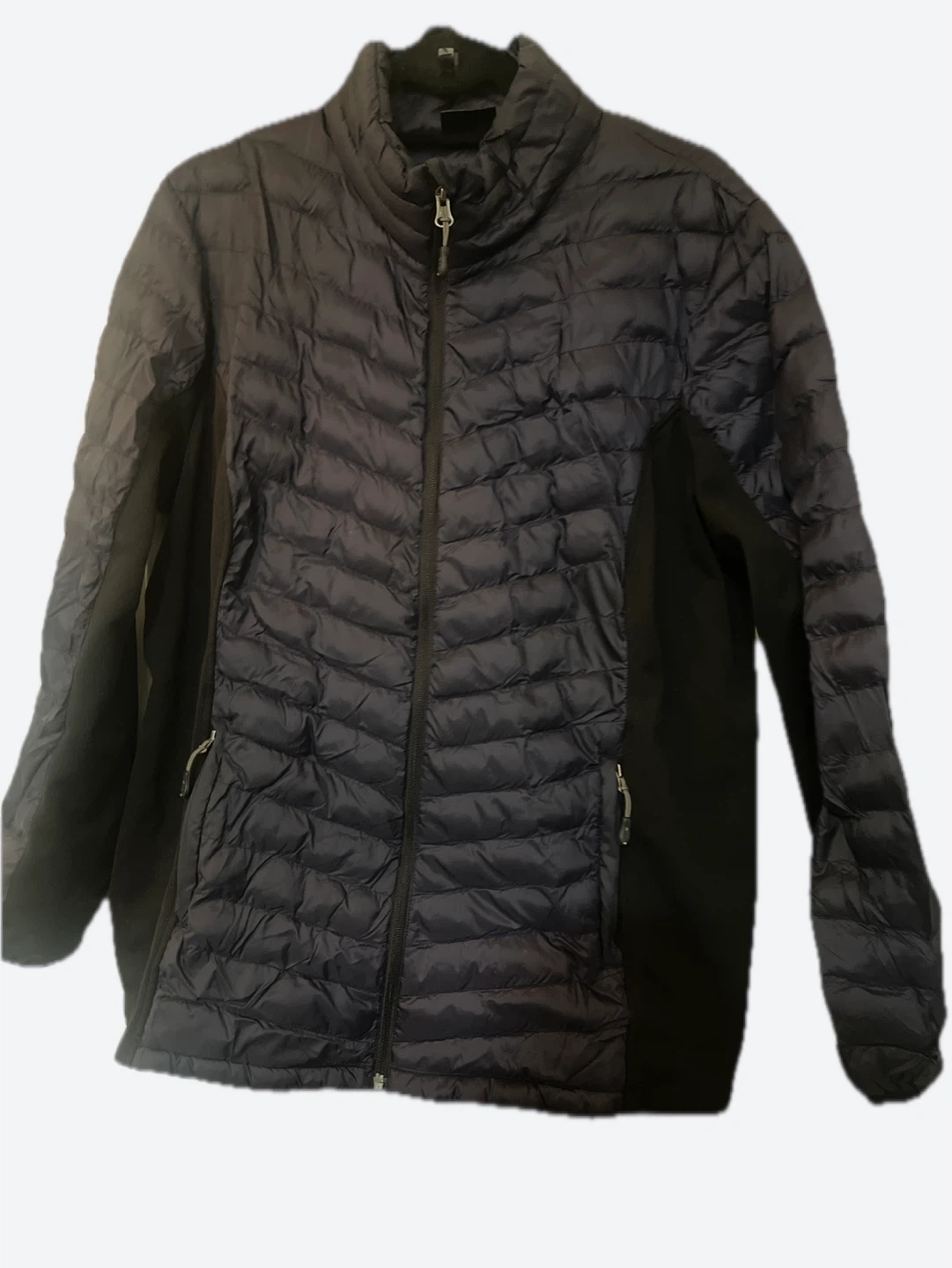 A Women lightweight puffer jacket in dark gray. It features a full zip front and zippered pockets. This jacket is perfect for staying warm during cooler weather.
