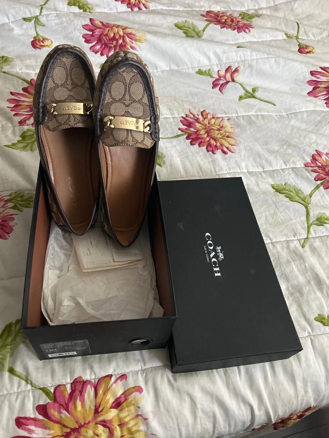 Selling a pair of Coach loafers in size 7.5M! They come with the original box. These stylish loafers are perfect for everyday wear and are in great condition. The classic Coach design will elevate any outfit!