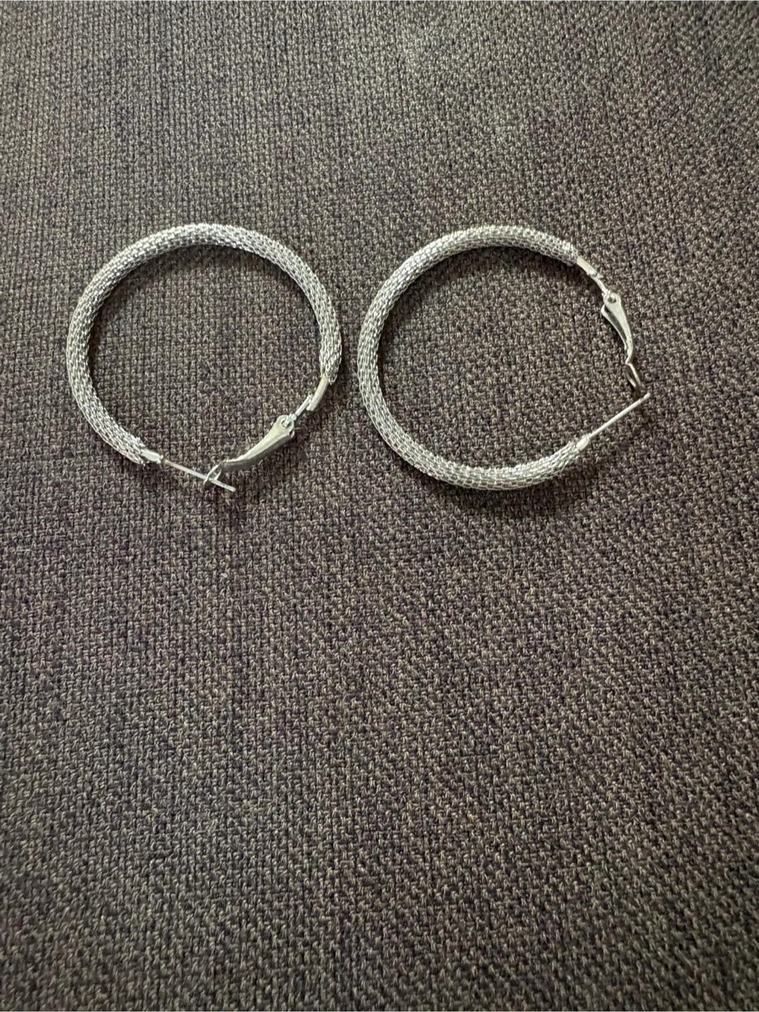 These are a pair of silver hoop earrings with a mesh texture. They have a post and latch closure. The earrings are lightweight and have a classic design.