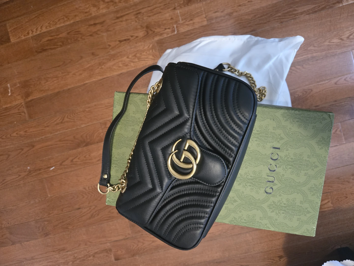 This black Gucci Marmont bag is crafted from matelassé leather. It features a gold-tone GG hardware and a chain strap. Includes original box and dust bag.