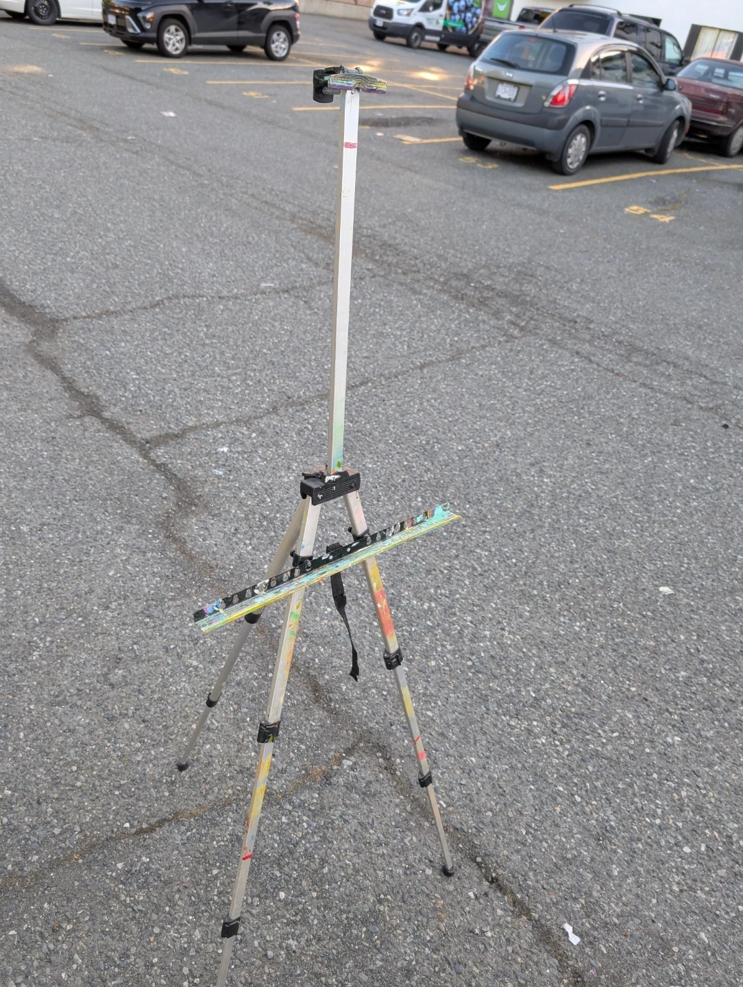 This is a portable art easel. It's made of metal and has adjustable legs for stability. Some paint splatters are visible on the legs and tray.