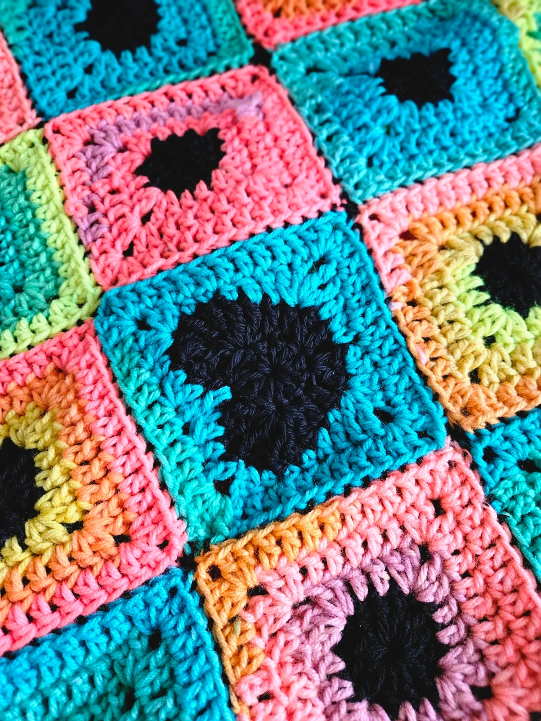 This is a vibrant, handmade crochet blanket featuring classic granny squares. It's a cozy throw made with colourful yarn, perfect for adding a pop of colour to any room. The squares are crocheted together to create a durable and soft textile.