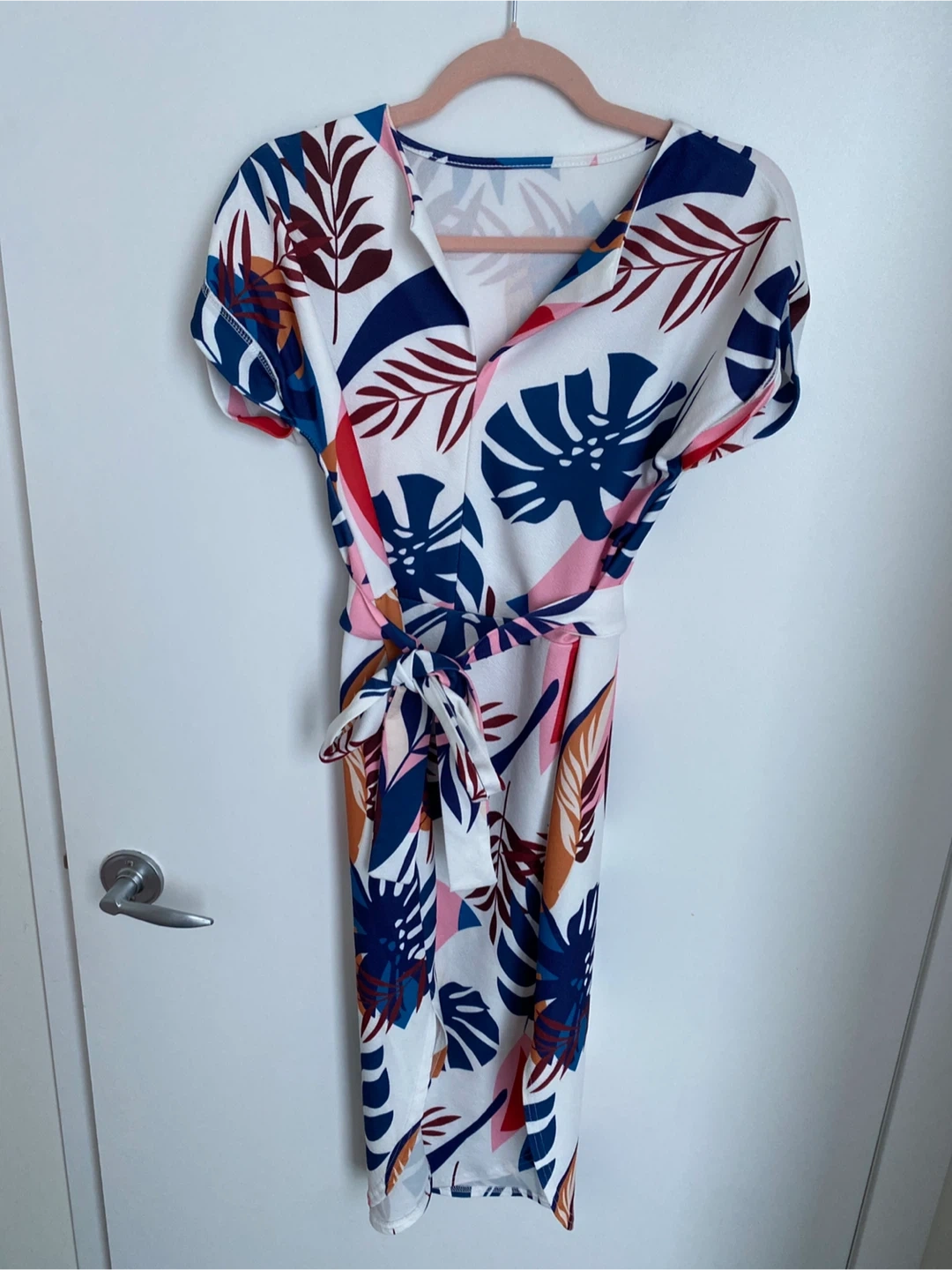 A stylish wrap dress featuring a vibrant tropical leaf print. It has short sleeves and a tie waist for an adjustable fit. This dress is perfect for warm weather occasions!