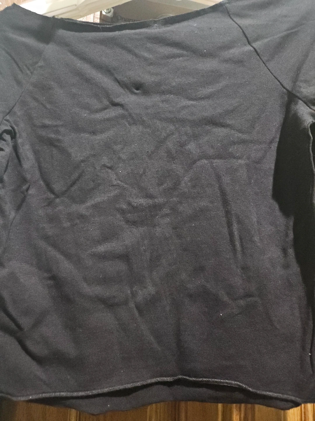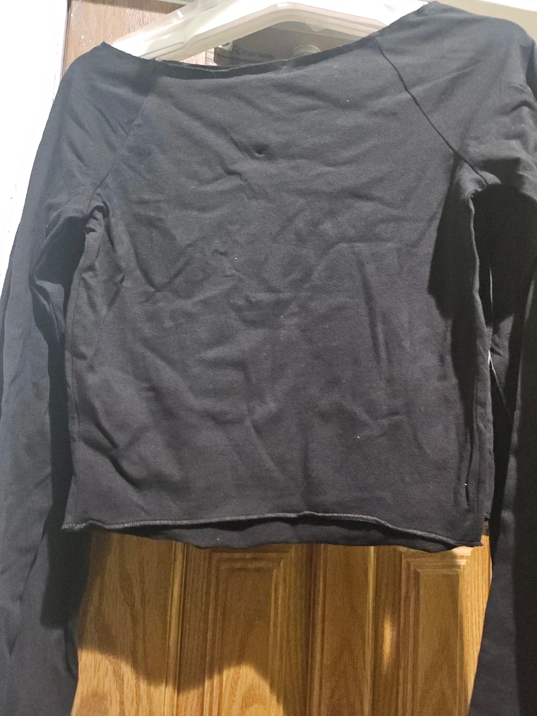 This is a black long sleeve cropped top. It's a size XS. It's made of a soft cotton blend. Perfect for layering or wearing on its own!