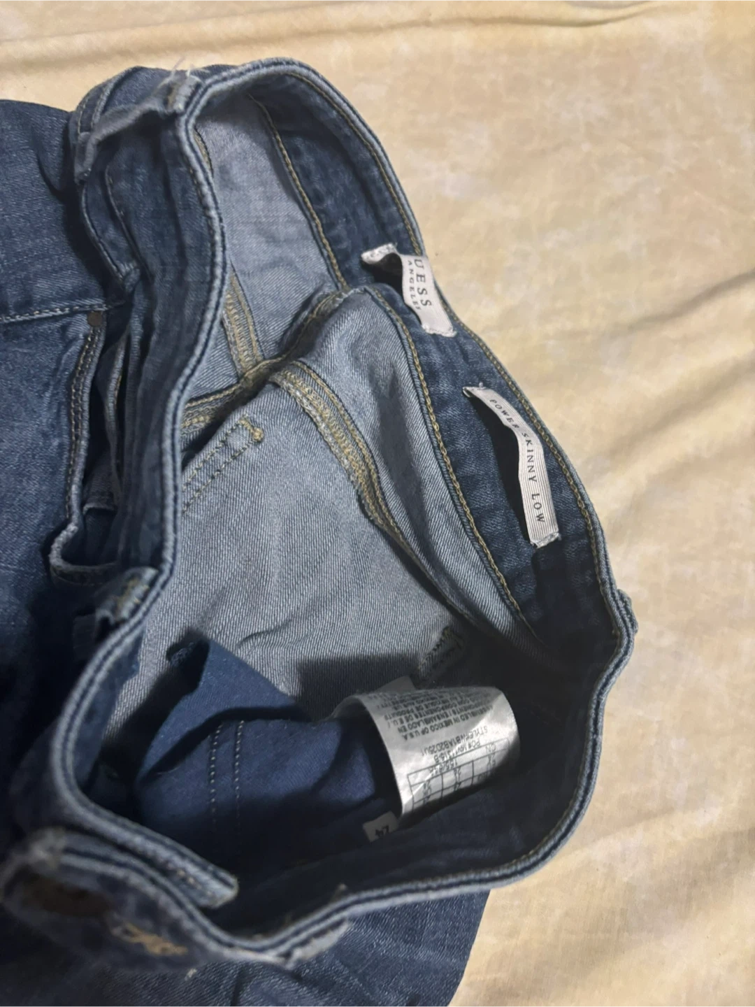 Guess skinny low rise jeans in blue wash. Made with a blend of cotton, polyester, and elastane for comfort and stretch. A classic denim staple for everyday wear!