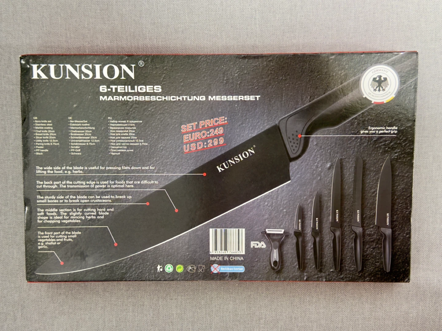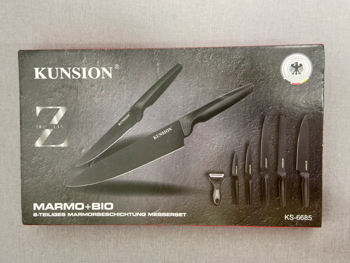 This Kunsion knife set includes 6 pieces with marble coating. It features ergonomic handles for a comfortable grip. Blades are designed for various cutting tasks, from delicate food prep to chopping vegetables.
