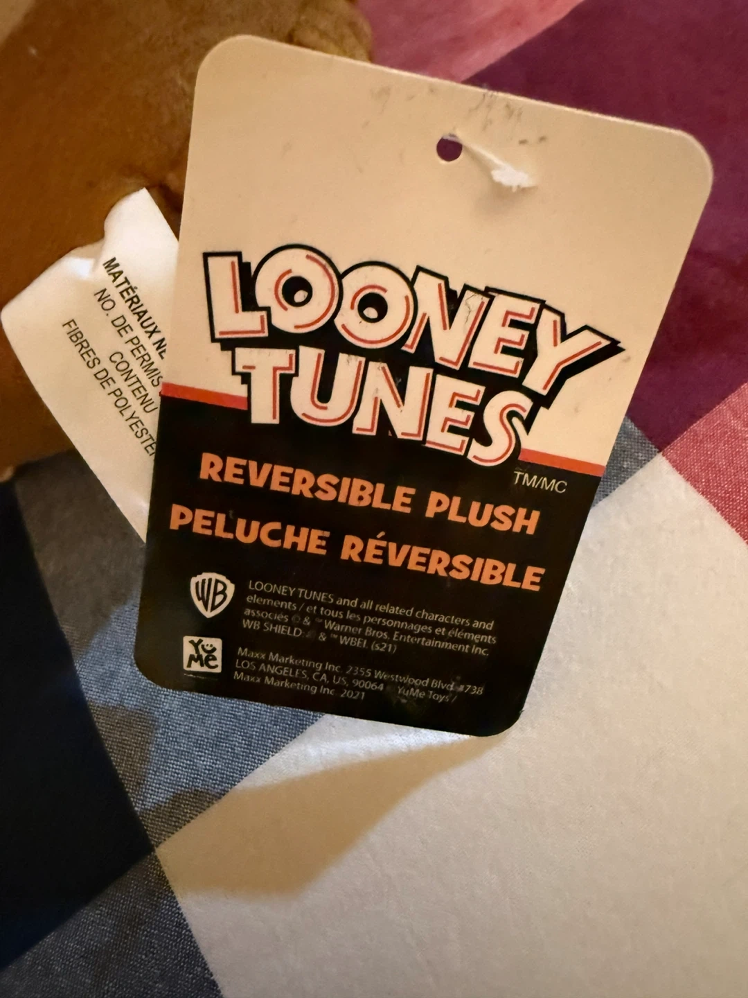 Looney Tunes reversible plush toy. It features a character on each side. Great for fans of the cartoon! Brand new with tags attached.