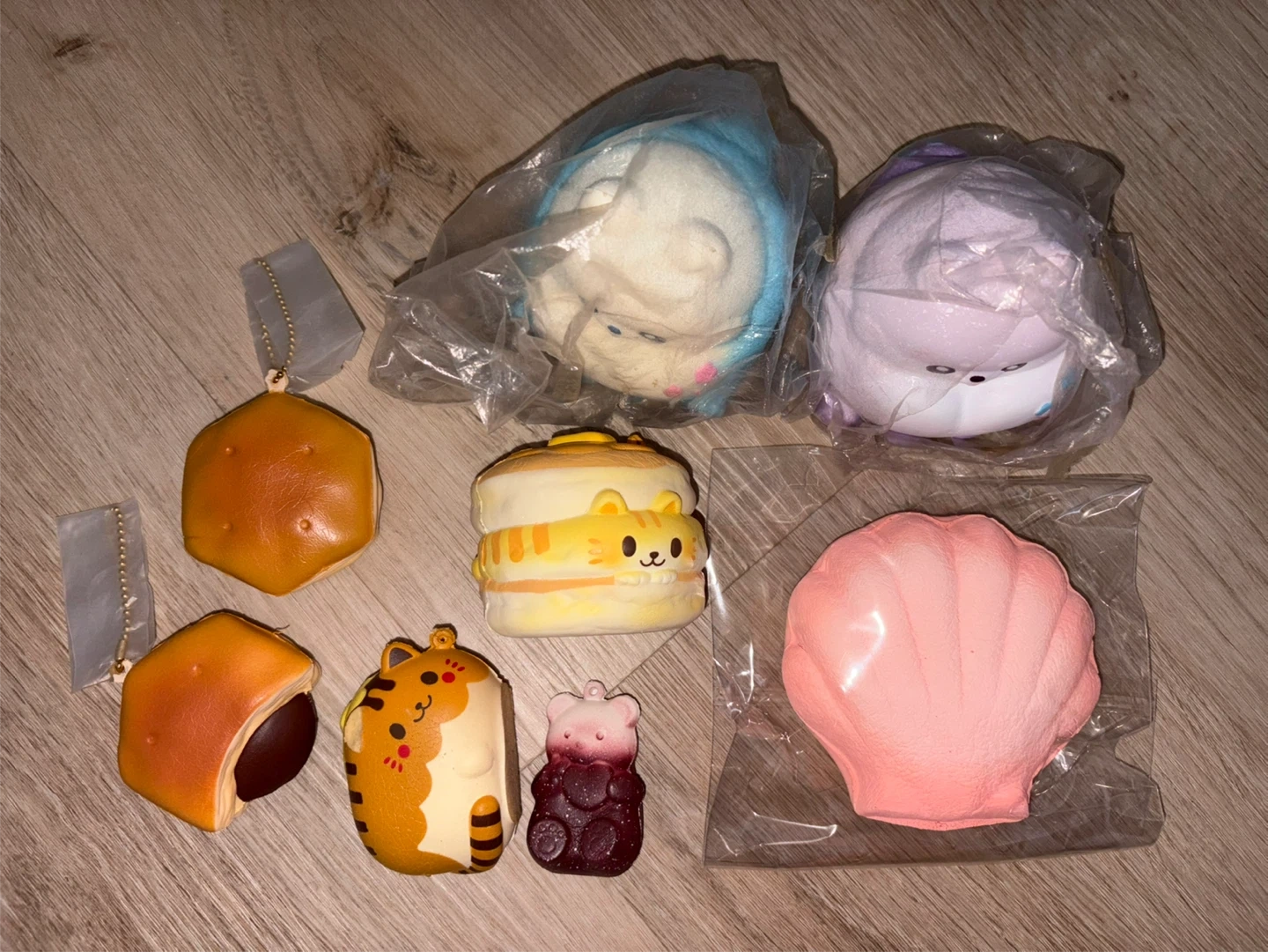 This lot includes several squishy toys with fun designs. You'll find a shell, a hamburger, a tiger, a bear, and a couple of round buns. They're all individually packaged.