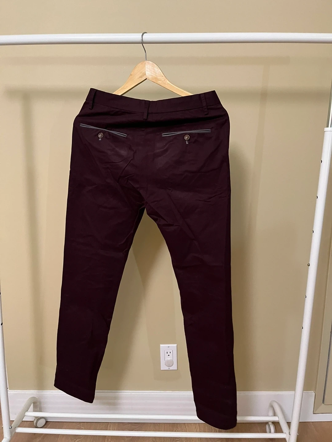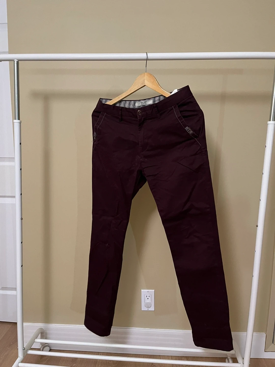 These are burgundy chinos with a slim fit. They're made of a cotton blend fabric for comfort. The chino style makes them versatile for casual or dressier occasions.