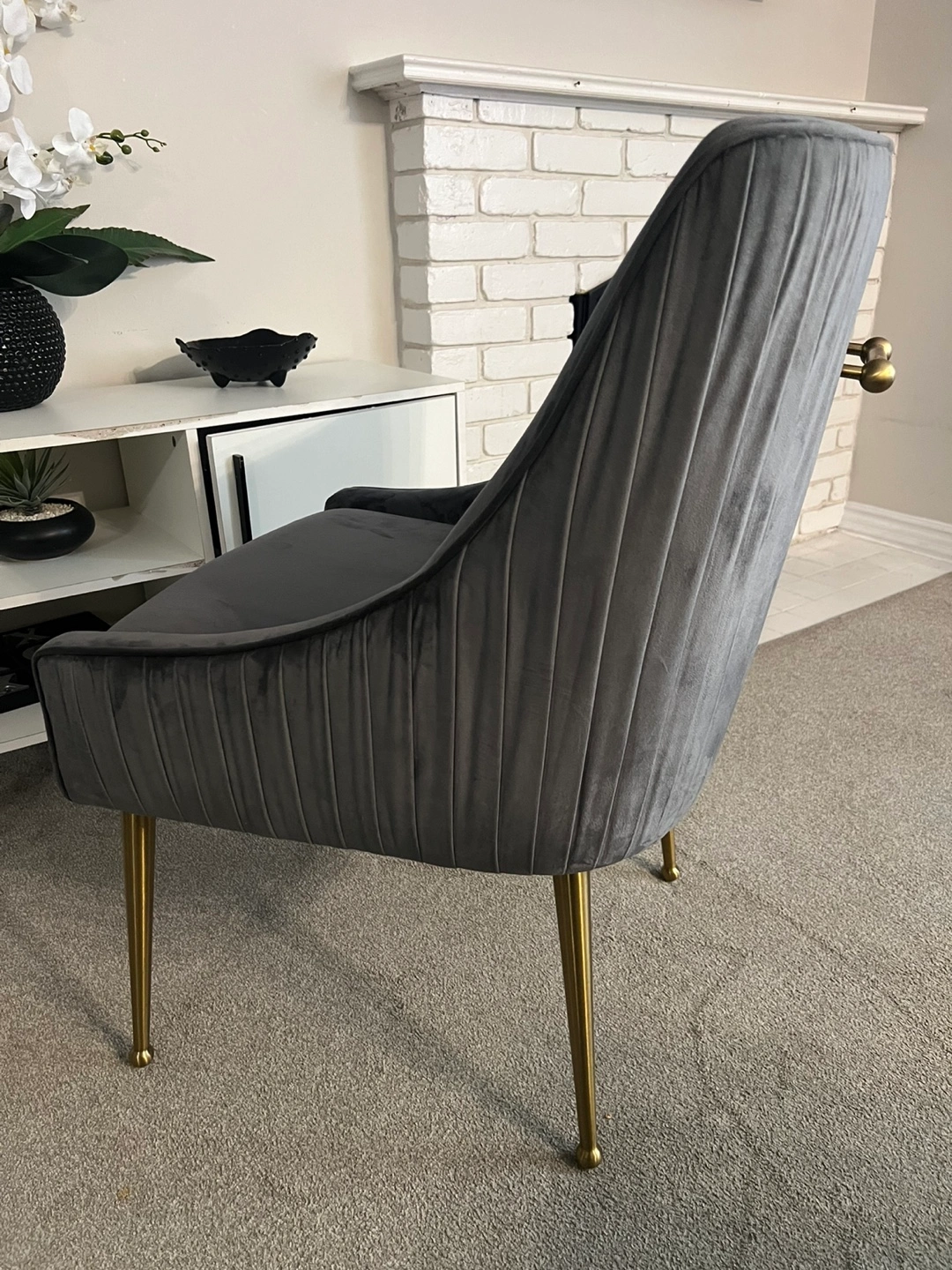 Description: Model is Modway EEI-3509-GRY; Assembled and New!! Blending Vintage elegance with modern appeal, discern refreshes a living space with its sloping armrests, gold accents, decorative pull ring, and chic pleated back