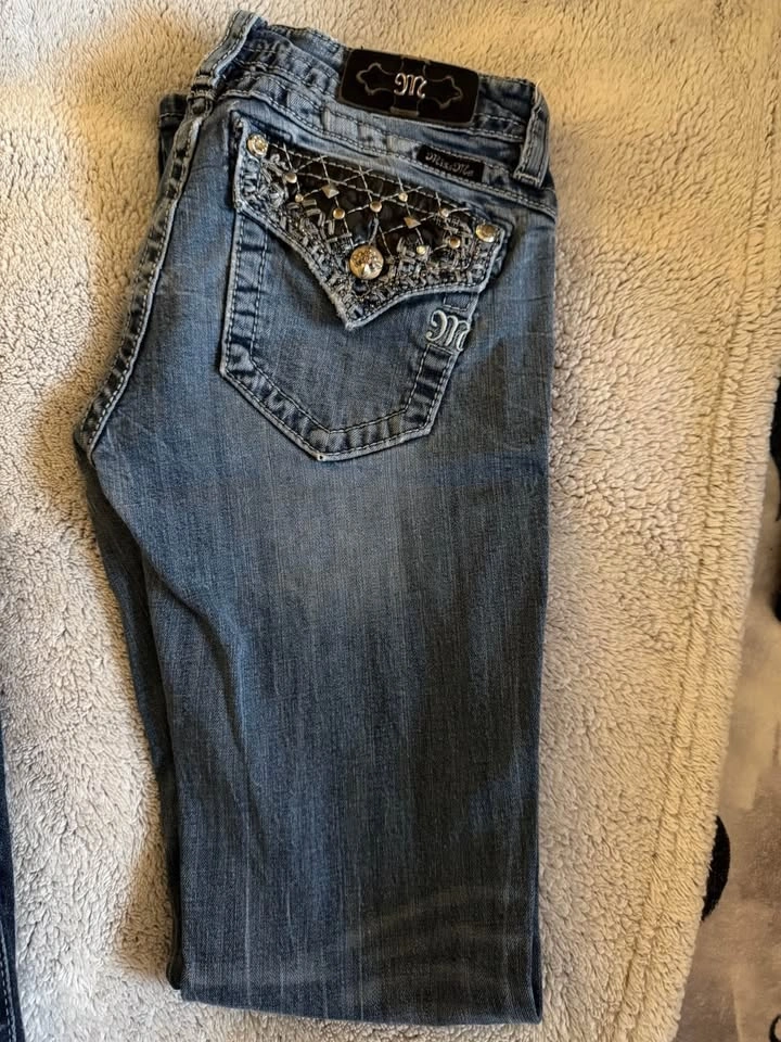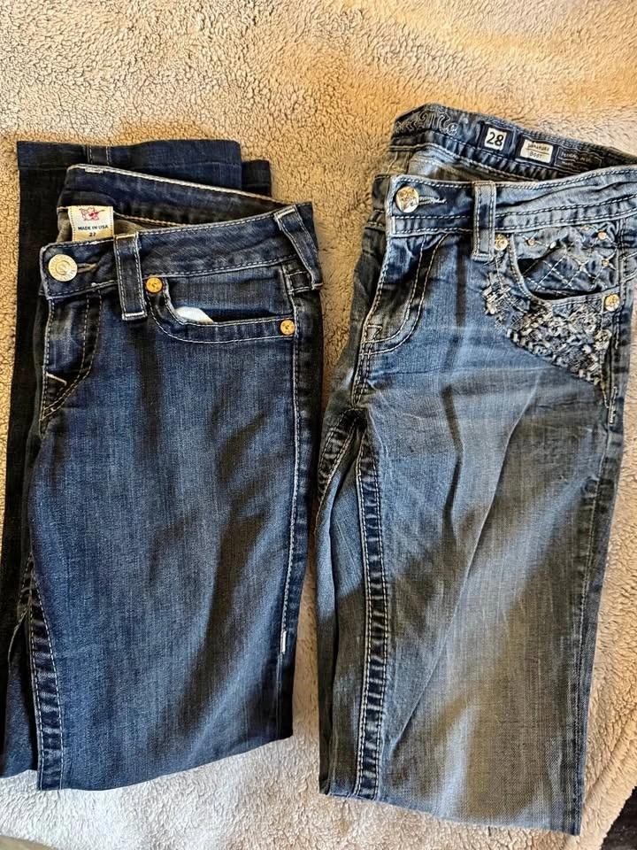 True Religion jeans size 27 waist and 28 inches long. Miss Me jeans size 28 waist and 31 inches long. Both are in very good condition, barely worn. $60 each or $90 for both.