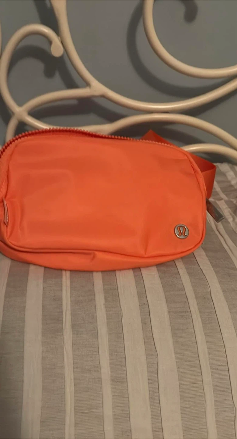 This is a Lululemon Everywhere Belt Bag in a bright orange colour. It's made of durable nylon. This versatile bag is perfect for carrying essentials hands-free.