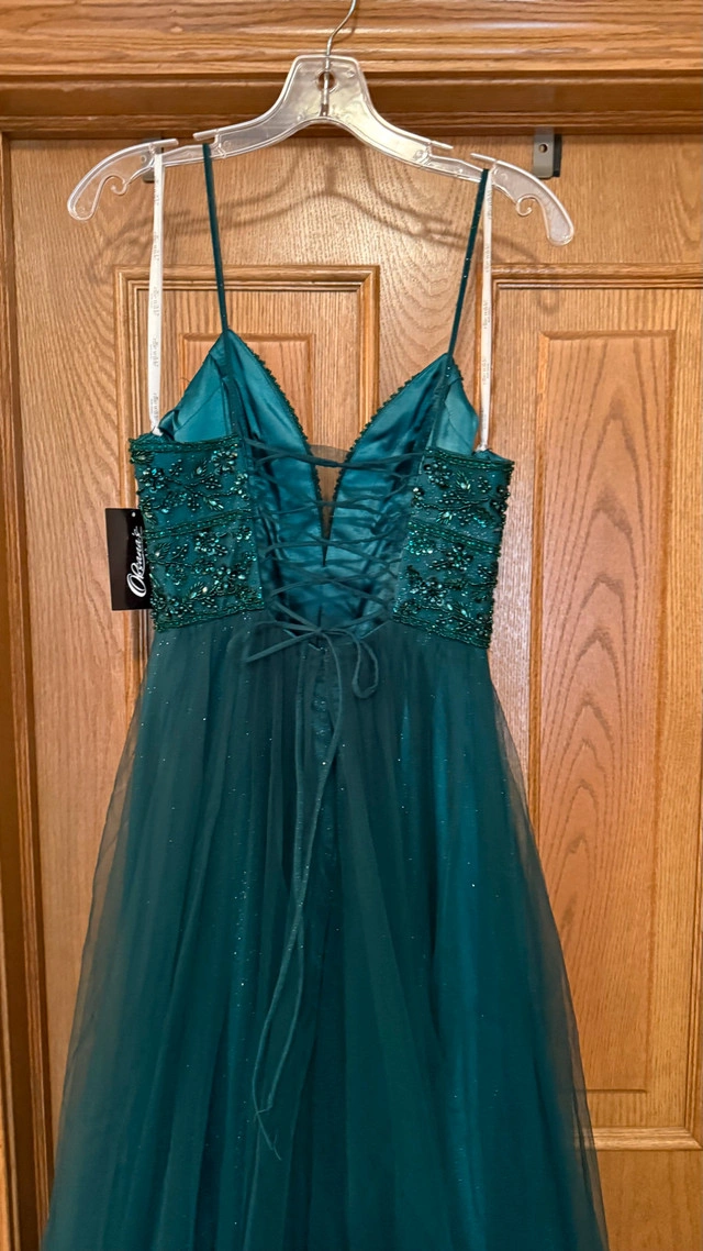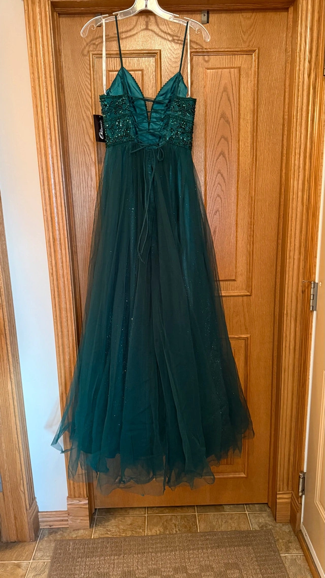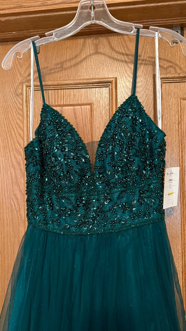 Size 4 emerald green formal dress. Never worn, never altered. Beaded top with tulle skirt and lace-up back. Comes with extra material if you want to cover the back. Perfect for grad or any formal event. Brand new with tags on.