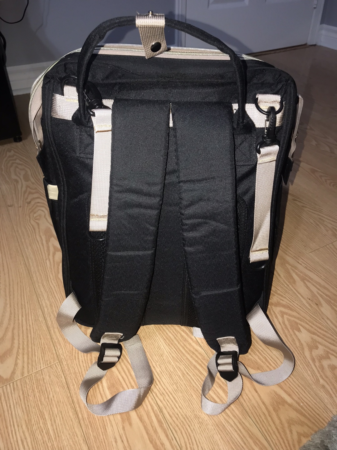 Selling a black diaper bag backpack. It's in great condition and ready for a new home. Perfect for parents on the go! It also comes with a phone charging port, also you can do a dipper change at anywhere and anytime because the bag can be extended out has a cushion pad and extended rods to gives it a perfect support. Quick easy and on the go for you and your baby.