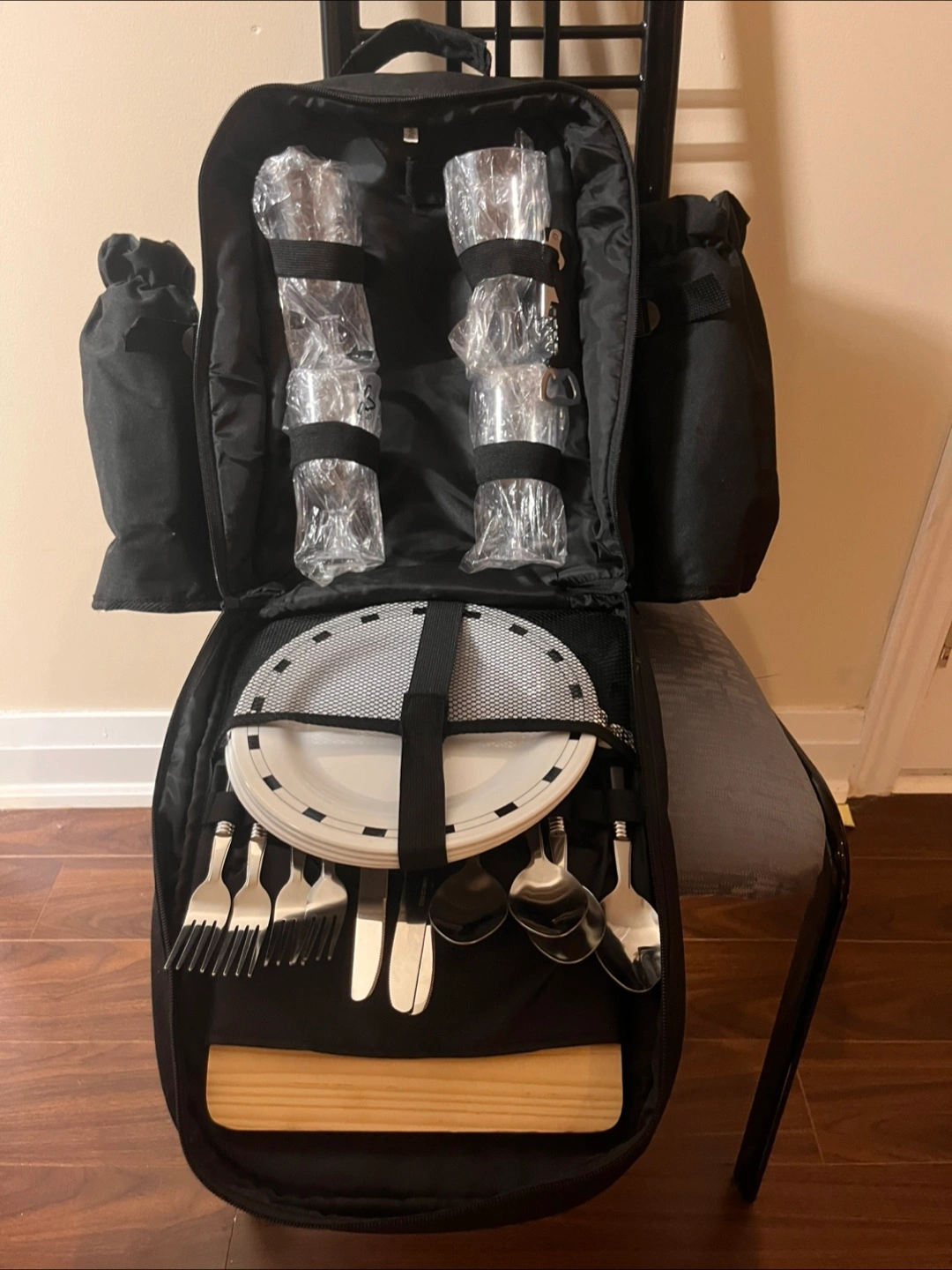 Unused Black Robins Appleby & Taub picnic backpack, complete with all the essentials for a lovely outdoor meal! It includes plates, cutlery, glasses, and a cutting board, making it perfect for picnics in the park or at the beach.