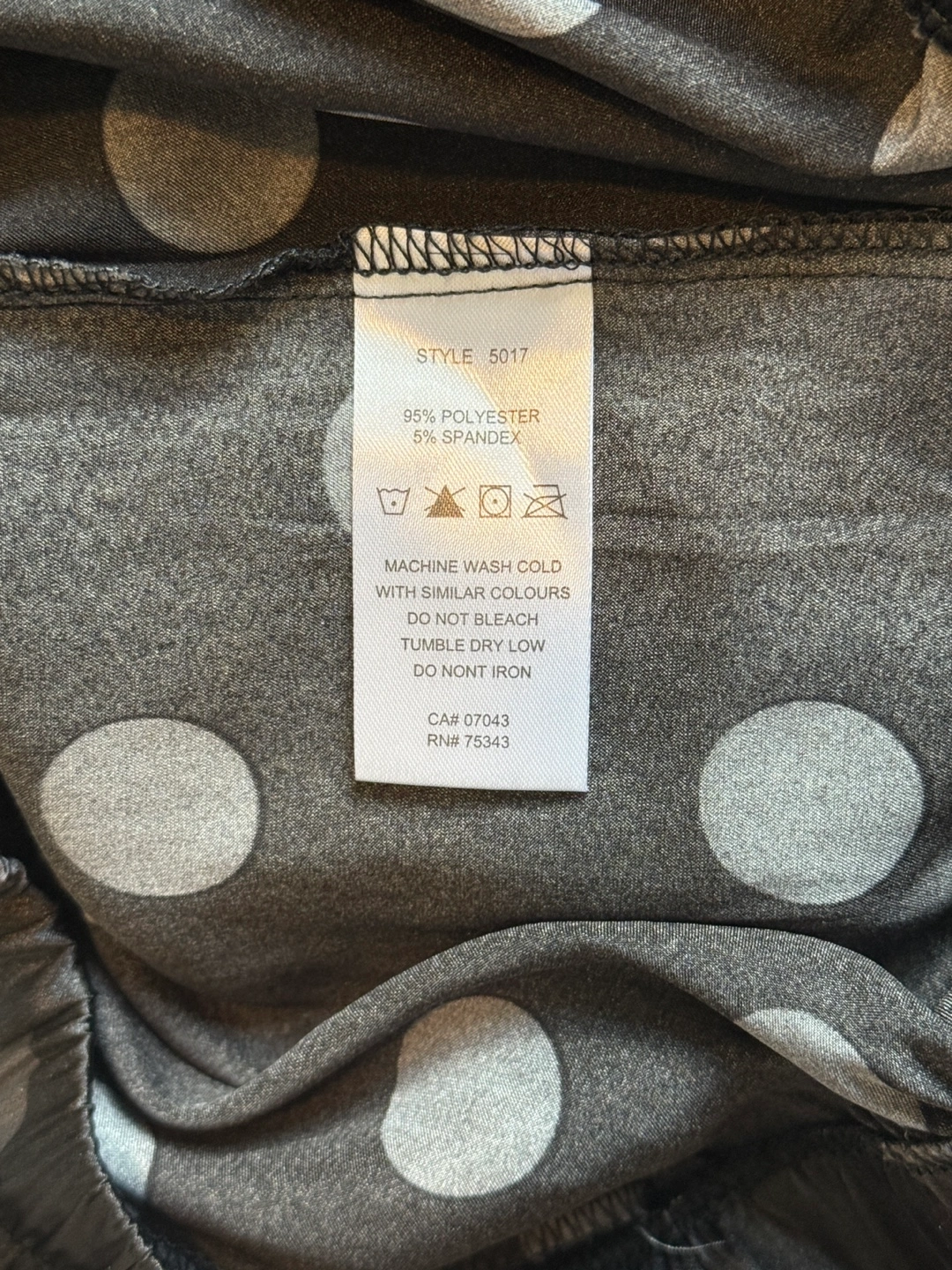 Black with grey polka dots and white out lining. Drawstring / stretchy waist. Soft silky feel.