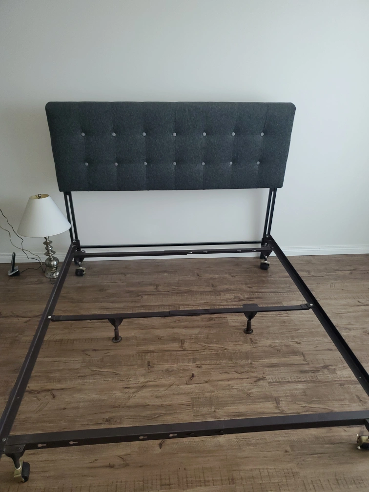 Selling a bed frame with an upholstered headboard. The headboard is a dark grey colour with button detailing. The frame is metal. Fits queen size mattress and box spring. Cash only. Must pick up.