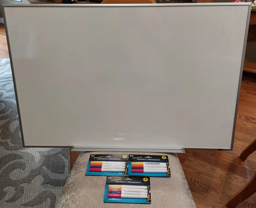In great condition! Has a tray to hold markers at the bottom. Comes with 3 new packs of markers ( 4 marks in each pack).