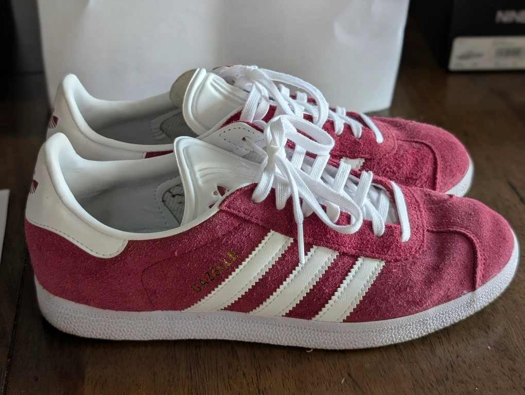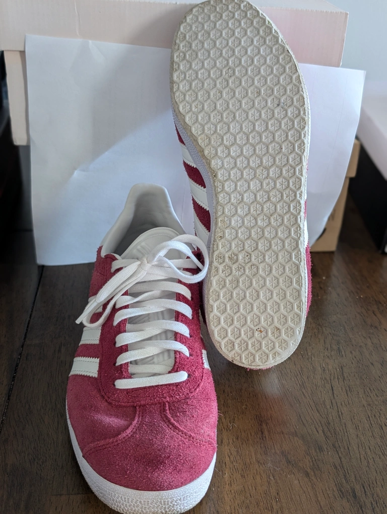 Selling a pair of Adidas Gazelle sneakers in burgundy! They're in great condition and a stylish addition to any wardrobe. The size is US 8. Perfect for everyday wear! Worn twice