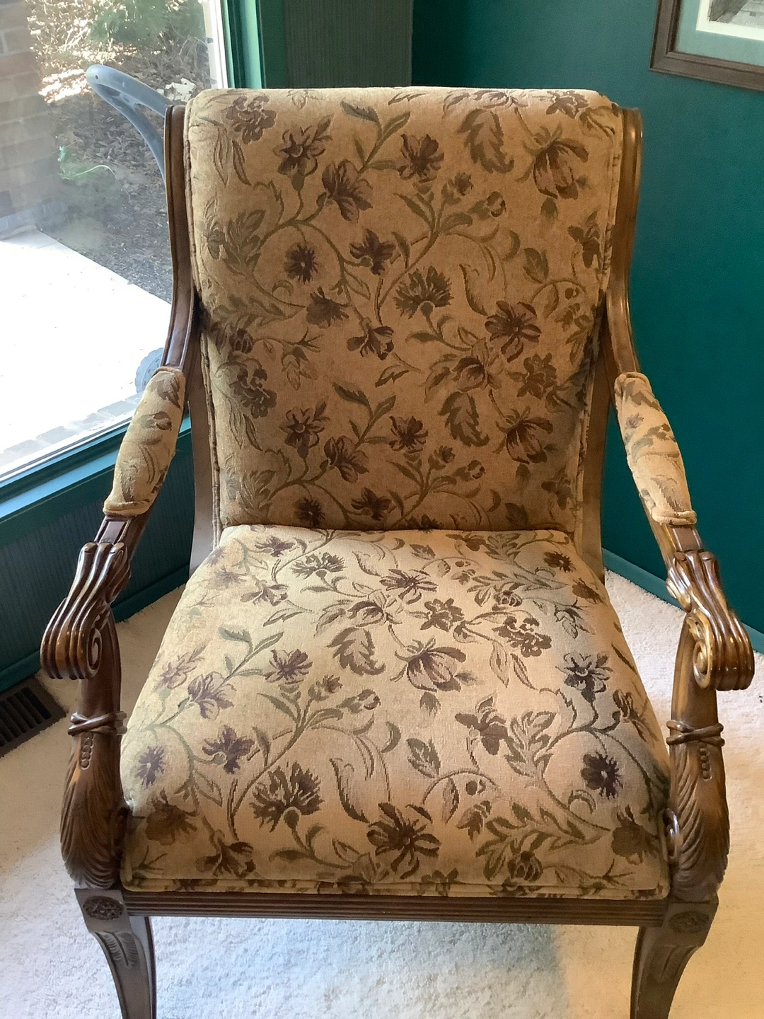 Selling a lovely vintage armchair with a floral pattern. It has a wooden frame with carved details on the arms and legs. The fabric is a beige colour with brown and green floral accents. It's a unique piece that could add a touch of elegance to any room!