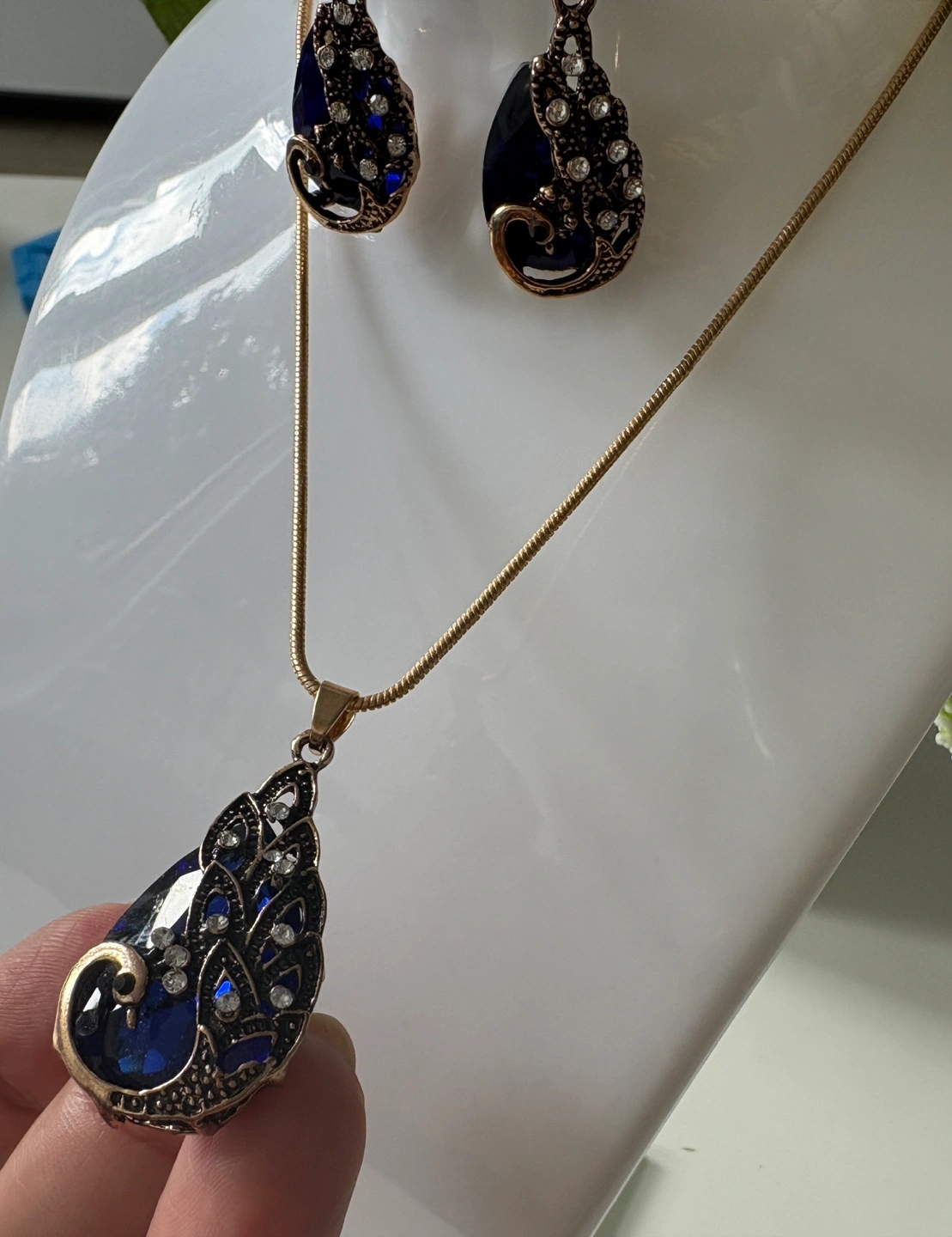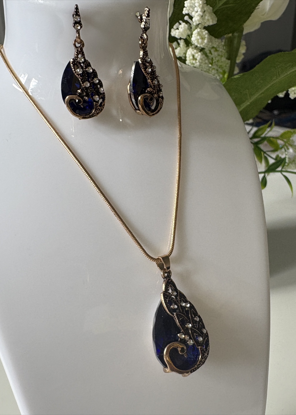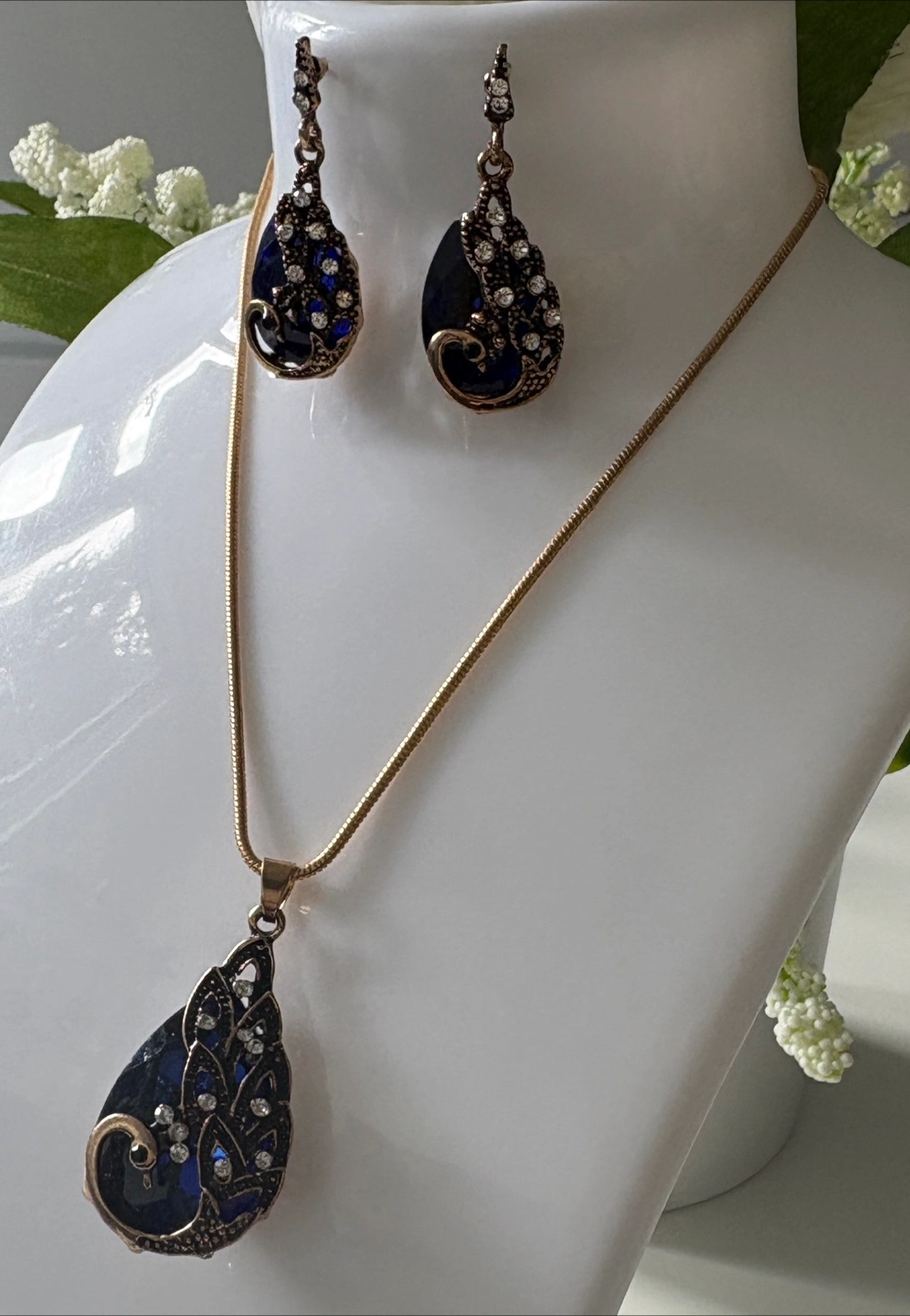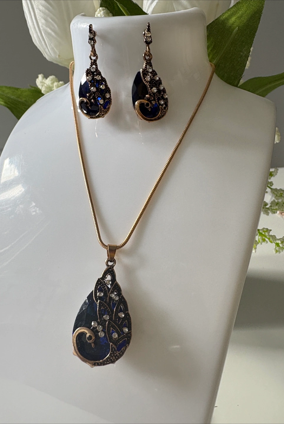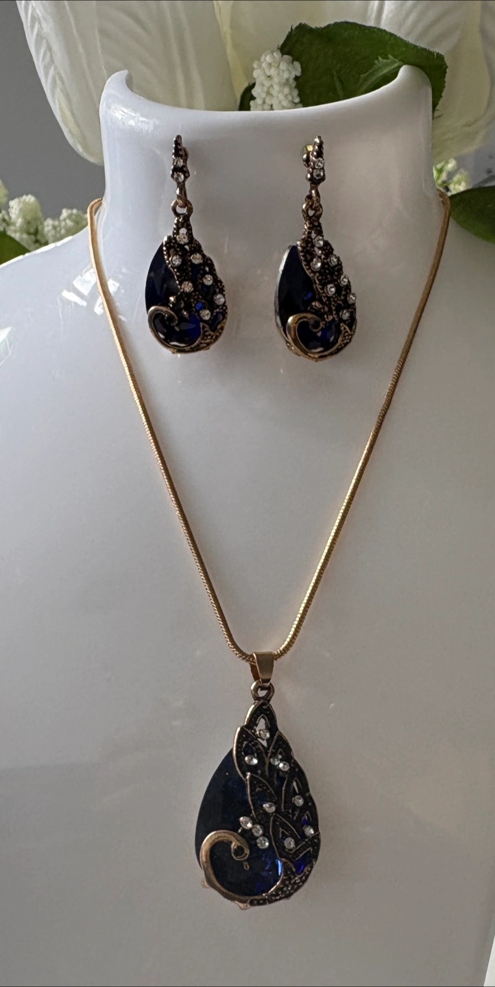 Beautiful necklace and earring set. The set features a teardrop design with blue and gold tones, adorned with rhinestones. Perfect for adding a touch of elegance to any outfit!