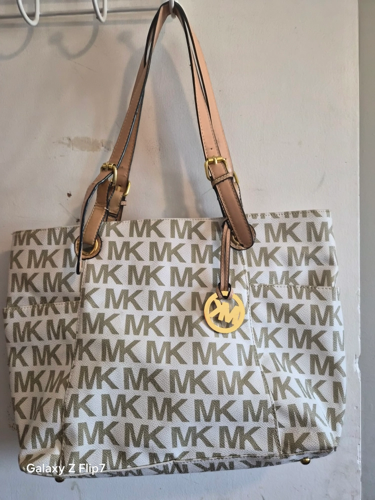 Here's a Michael Kors tote bag with the classic MK logo pattern. It's in great shape and ready for a new home!