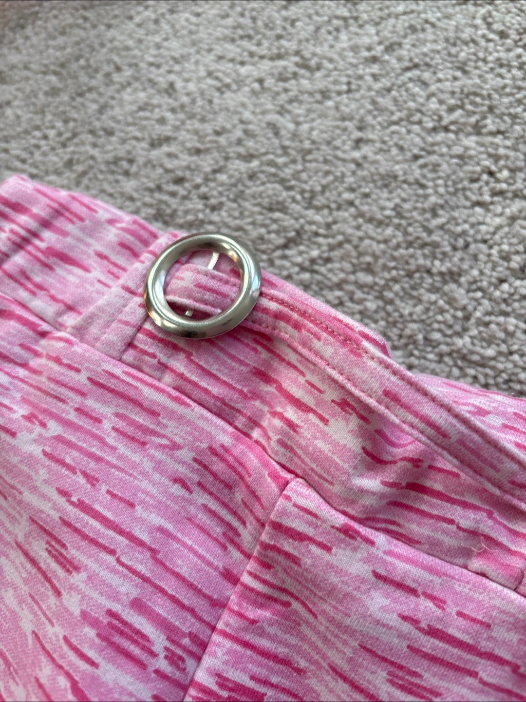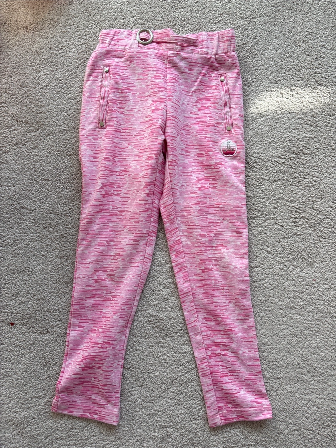 Selling a pair of girls' Apple Bottoms pants in pink .They feature a stylish pattern and the Apple Bottoms logo. Great for casual wear!