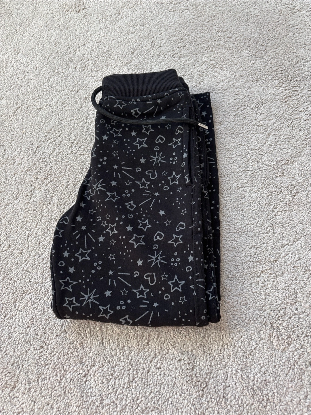 Cozy black joggers with a fun star pattern! These are from Kayal. They're super comfy and perfect for lounging around or running errands