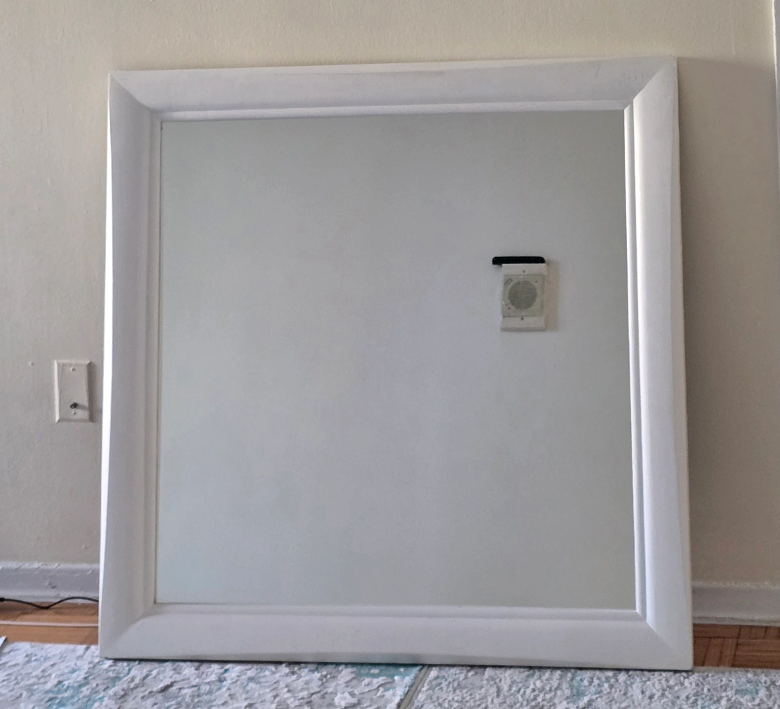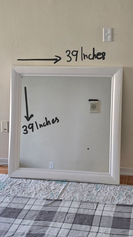 Selling a square mirror with a white frame! It measures 39 inches by 39 inches and would look great in any room