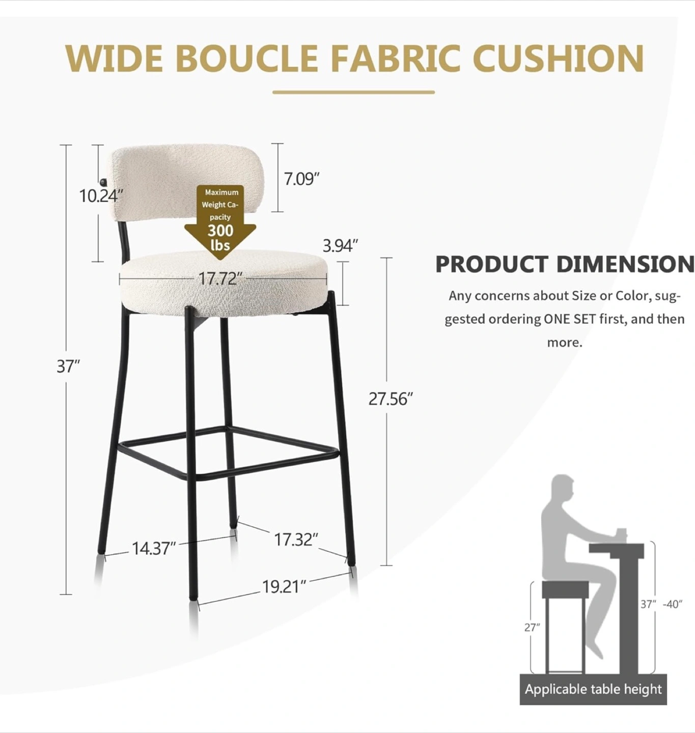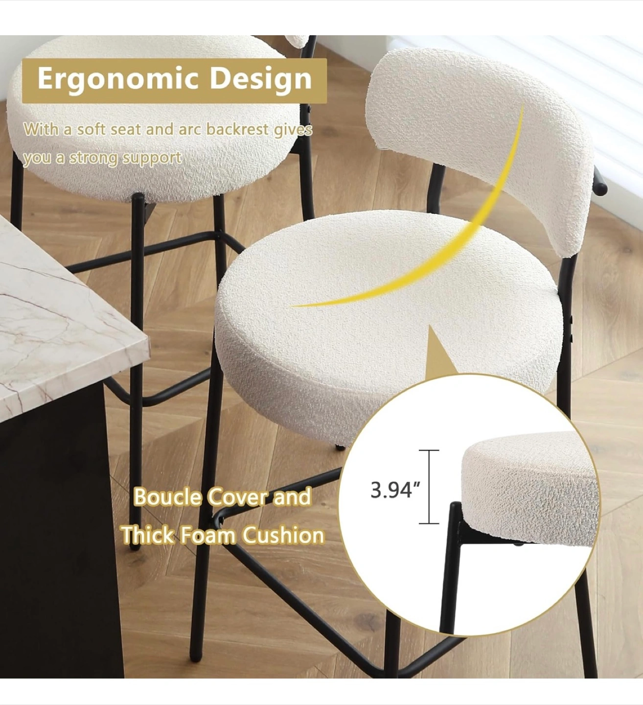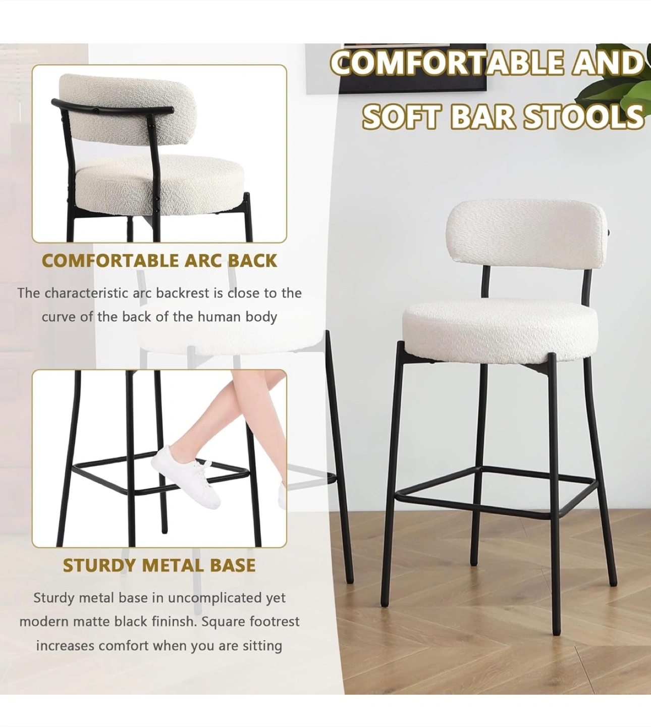 Looking to add some comfy seating to your kitchen island or bar area? I'm selling a set of two bar stools featuring soft boucle fabric and sturdy metal bases.