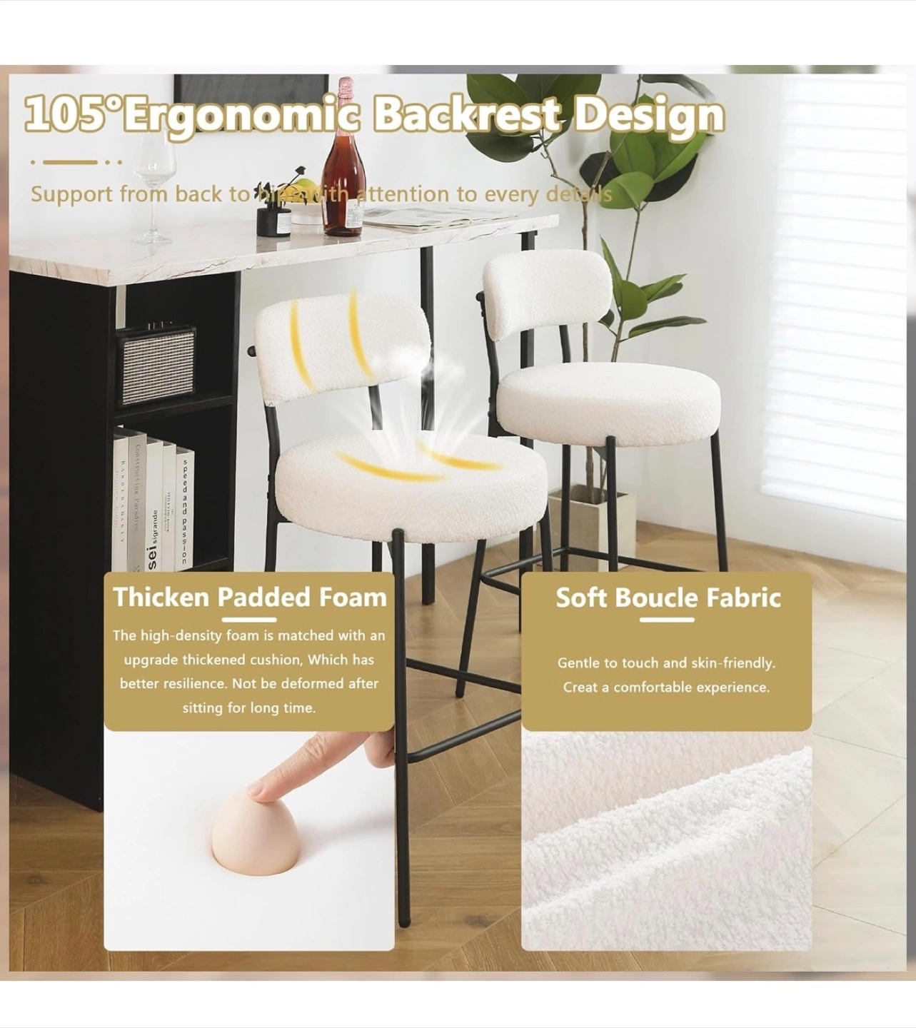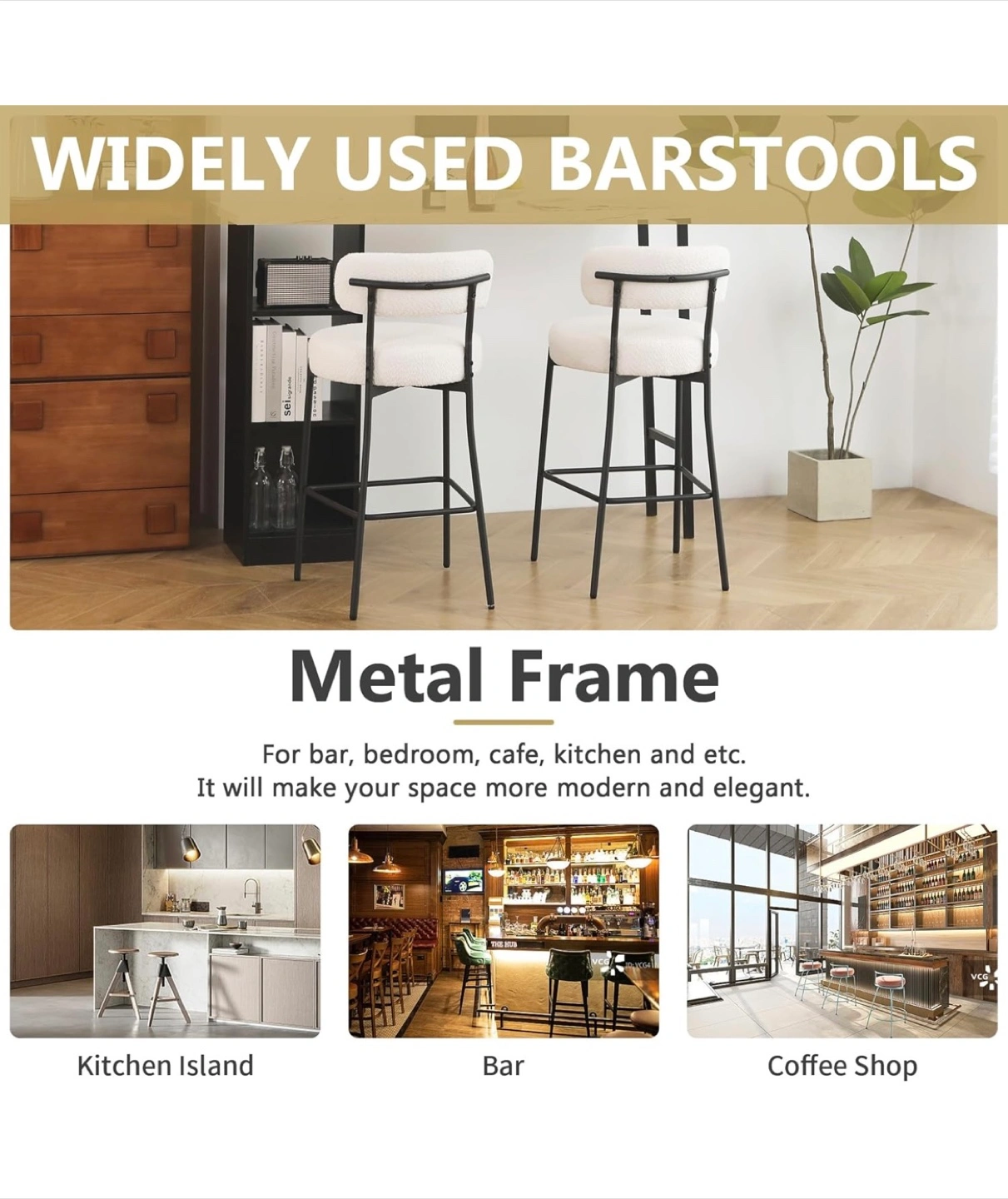 DYHOME Bar Stools Set of 2, 28 Inches Boucle Counter Height Bar Stools with Back, White Modern Tall BarStools with Metal Legs for Kitchen Island