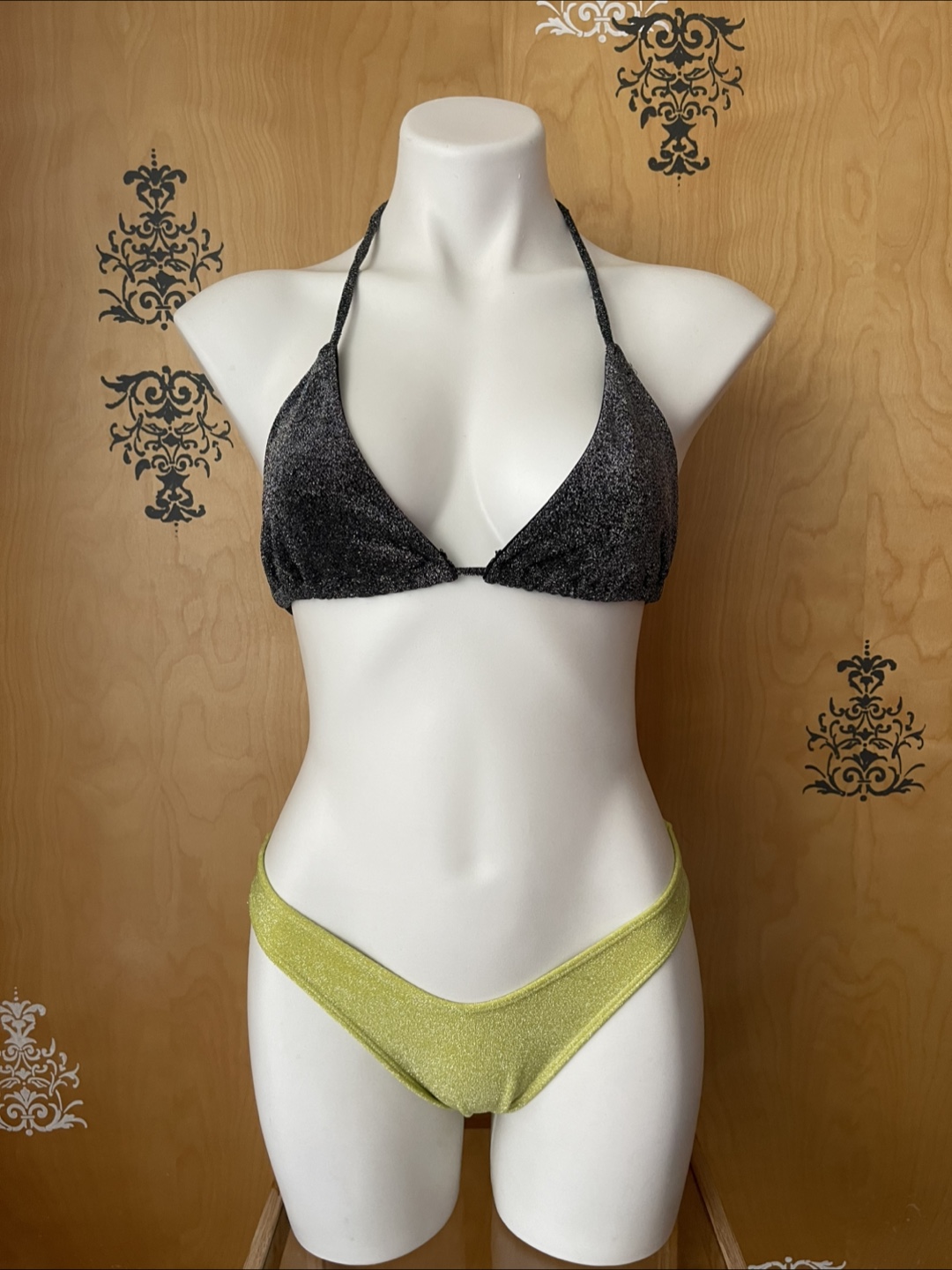 Stylish black and yellow/green tint shade bikini set perfect for a day at the beach. Enjoy comfort and style with this eye-catching swimwear.