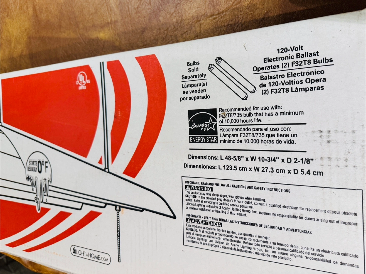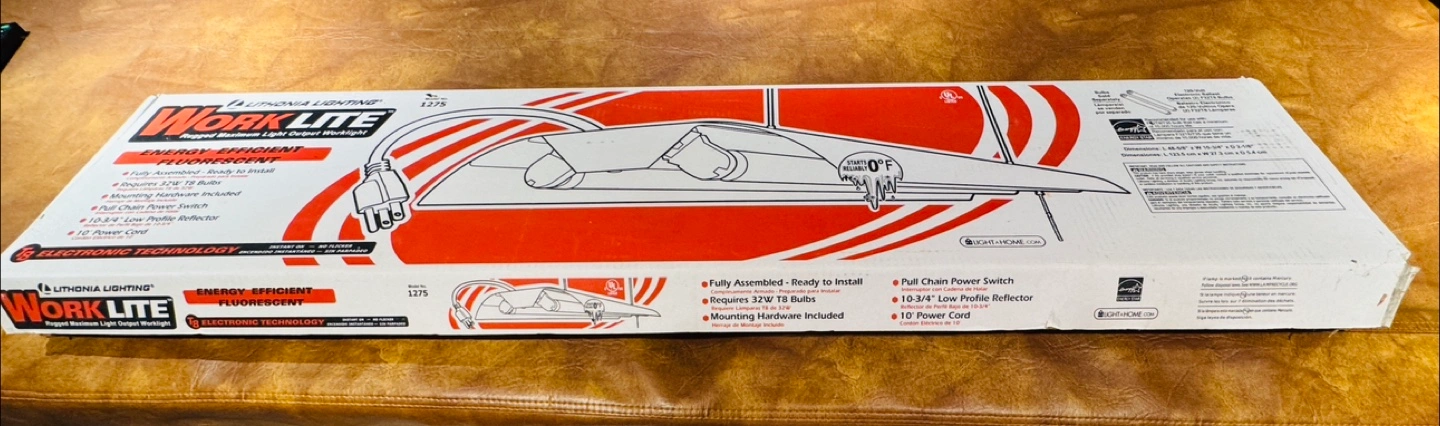 18Selling a Work Lite fluorescent shop light, model number 1275. It's fully assembled and ready to install. - Requires 32W T8 bulbs - Has a 10-3/4" low profile reflector - Includes mounting hardware - Has a 10' power cord It's 48-5/8" x 10-3/4" x 2-1/8" (123.5 cm x 27.3 cm x 5.4 cm). Comes with the original box