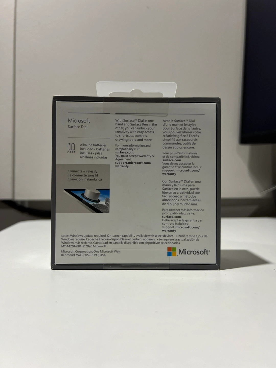 Selling a like-new Microsoft Surface Dial! It comes with the original box and includes the alkaline batteries needed to get you started. This dial connects wirelessly and is ready to help you with drawing tools and more!