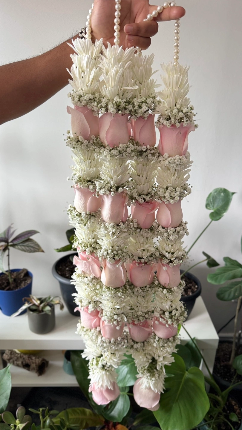 Selling a beautiful floral garland, perfect for adding a touch of elegance to any occasion! It features a lovely arrangement of pink roses and white flowers, strung together with delicate pearl beads.Please DM me if you are interested to know more
