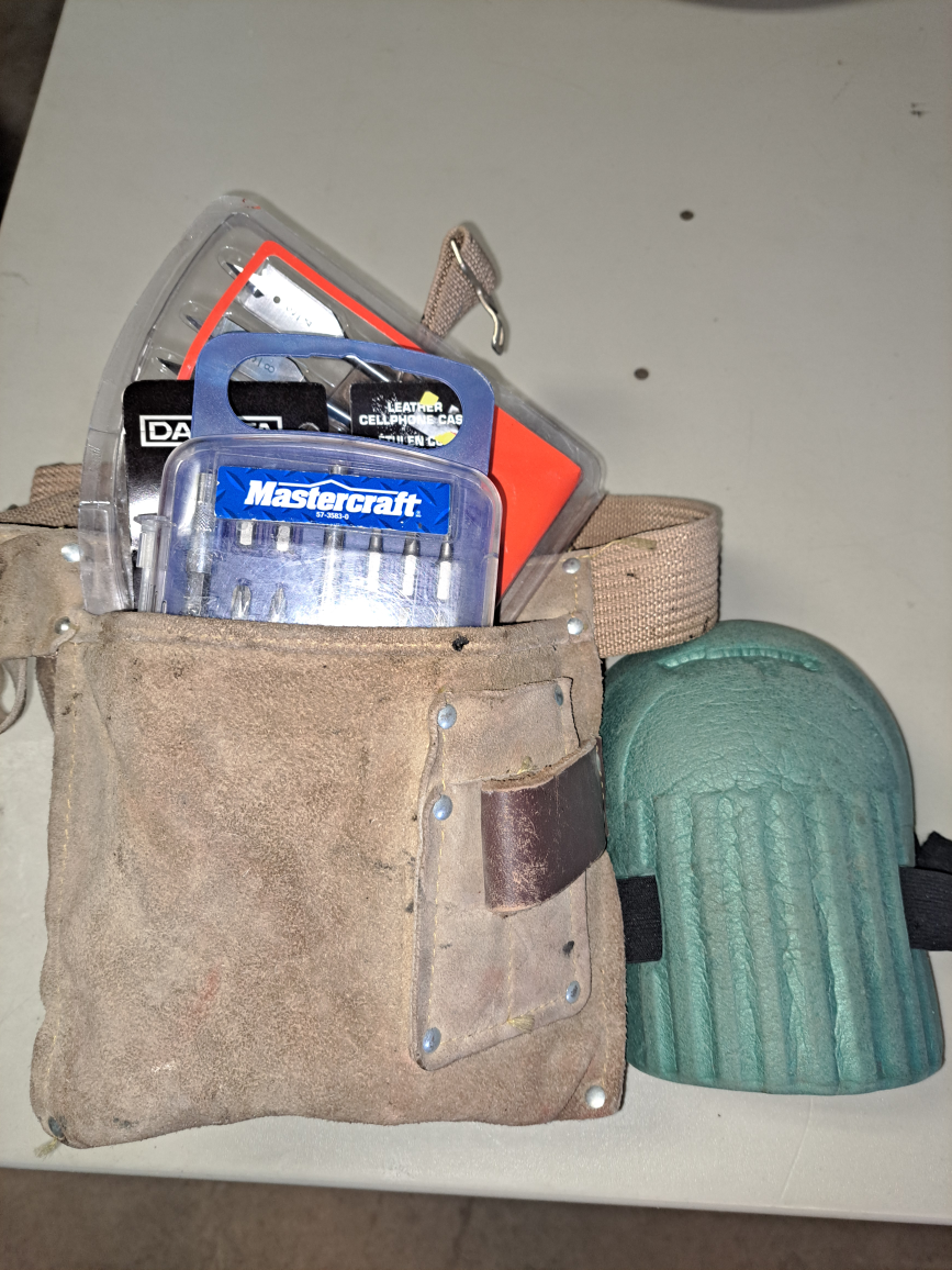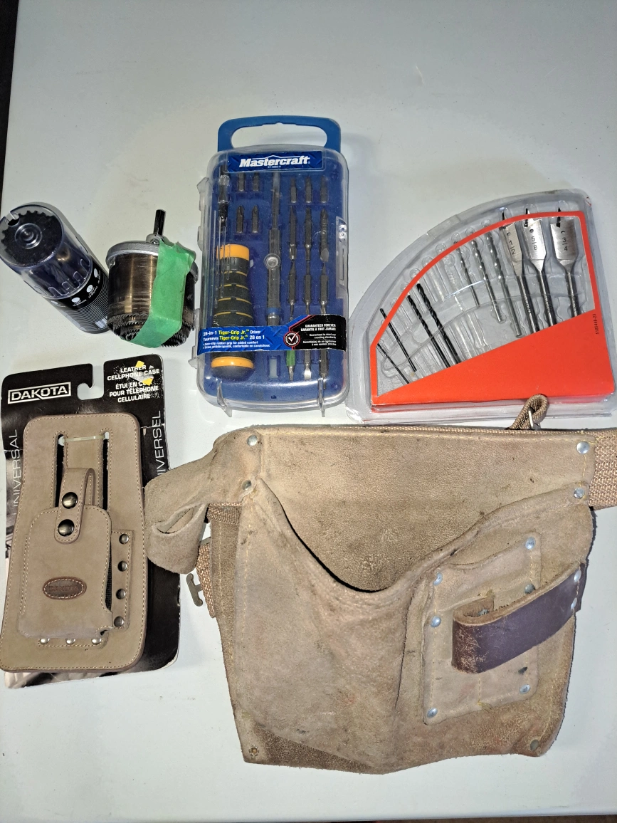 Selling a used tool belt with some assorted tools. Includes a Mastercraft screwdriver set, drill bits, and a Dakota leather cell phone holder. The leather tool belt shows signs of wear but is still functional.