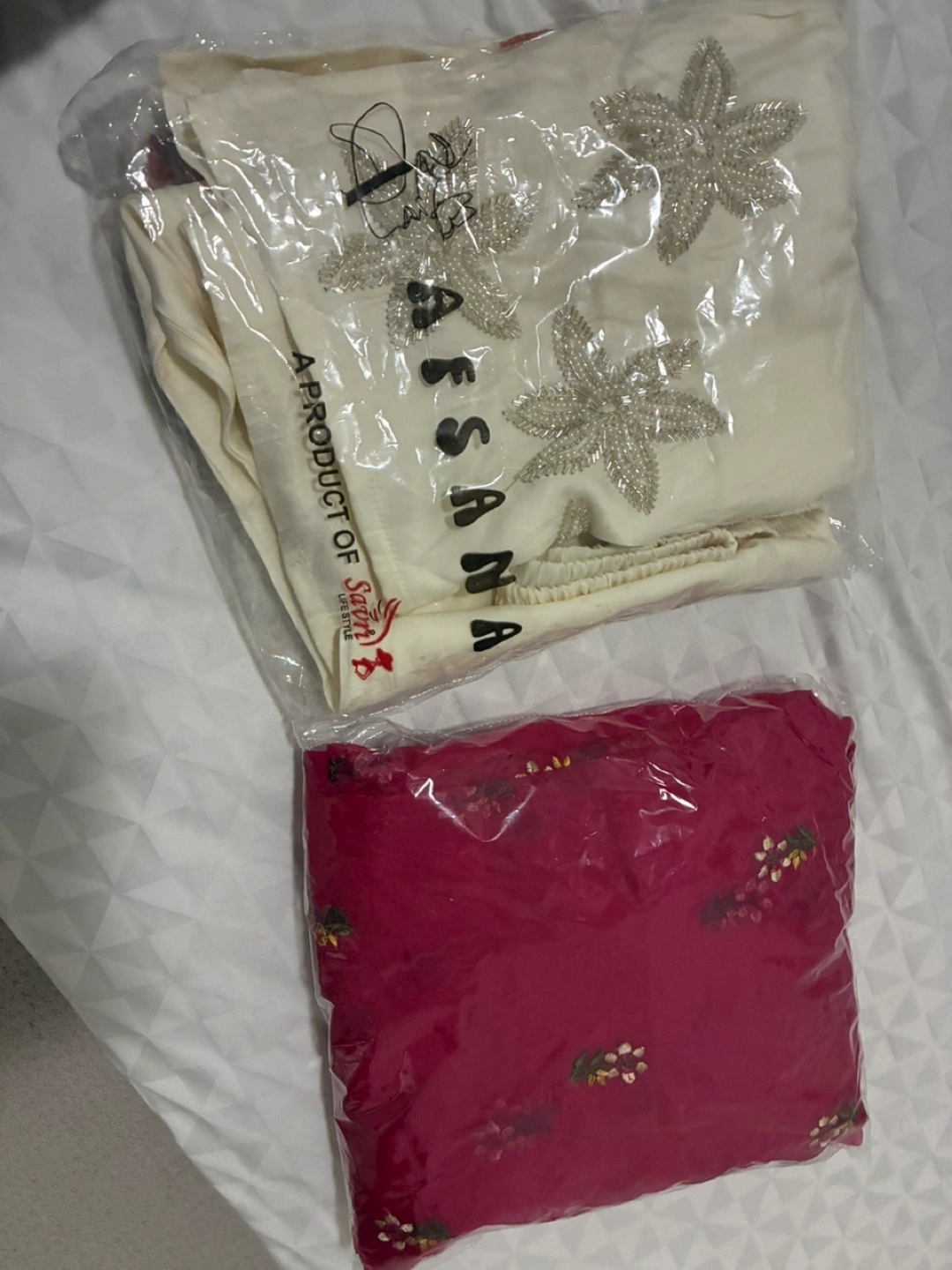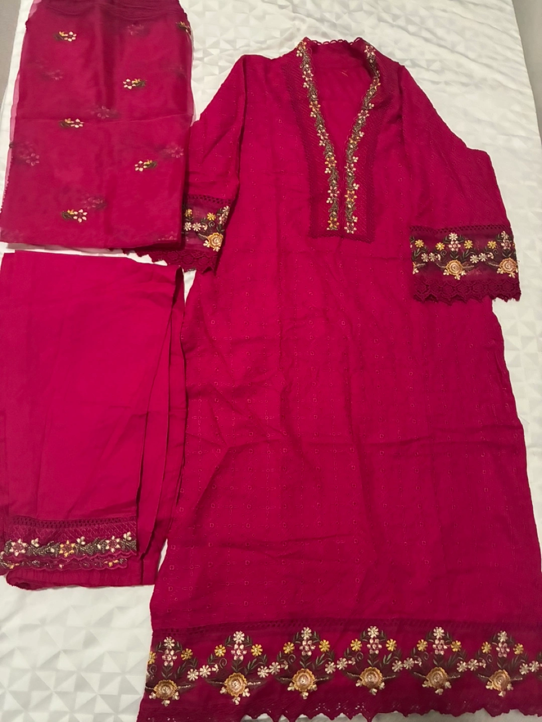 Selling a beautiful red salwar kameez suit with intricate embroidery. It's in great condition and ready for a new home! The set includes the kameez (tunic), salwar (pants), and dupatta (scarf).