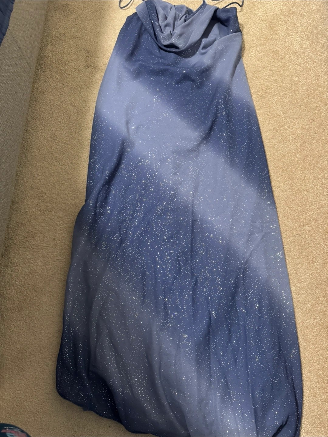 Here's a beautiful blue dress with a starry pattern! It's in great condition and ready for a new home. The dress has a nice flowy feel and would be perfect for a special occasion or just a fun night out. Hardly worn and the retail price was 150$ selling it at a low cost