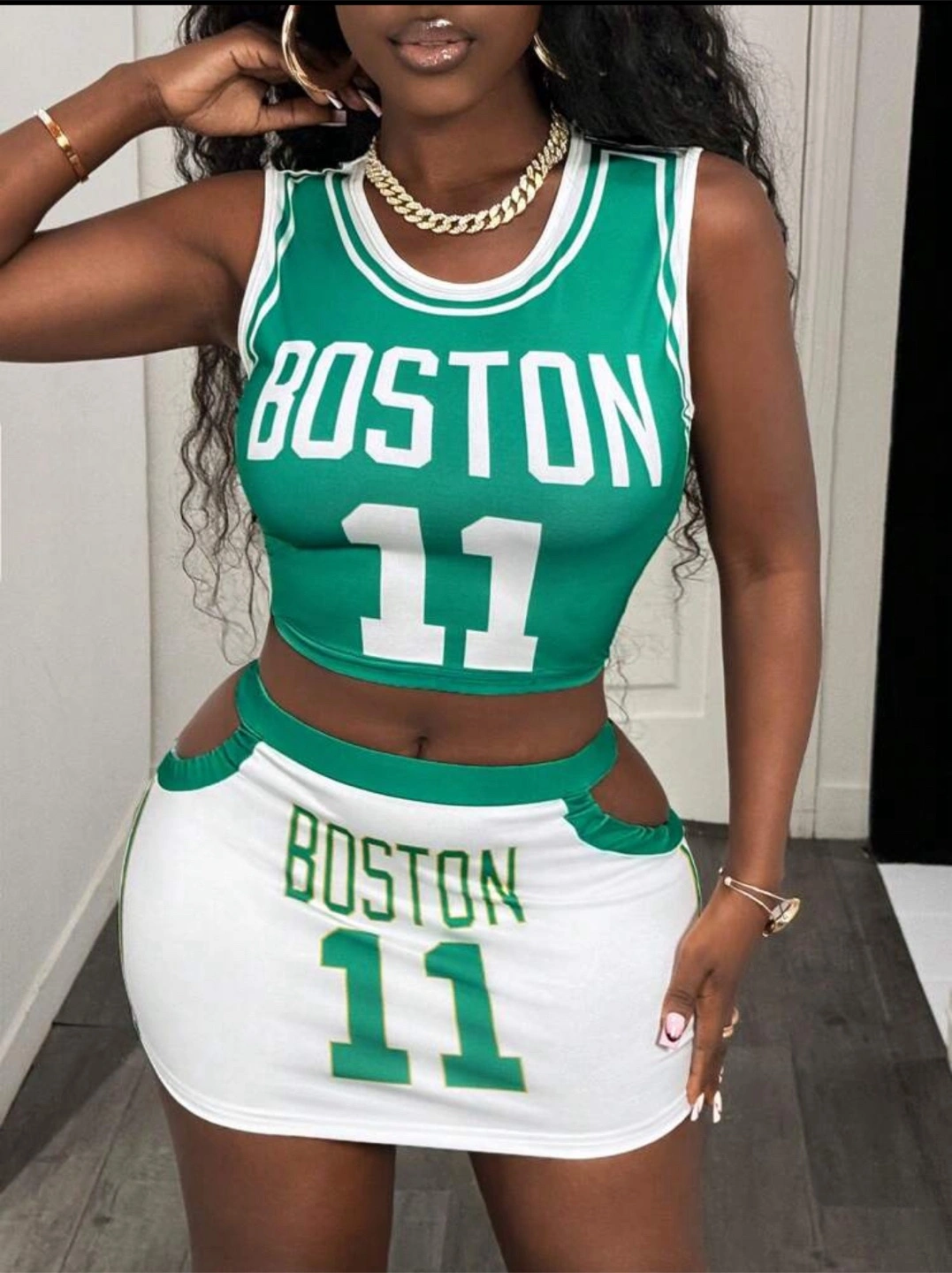This is a Boston themed crop top and skirt set. The top and skirt both have the number 11 on them. The skirt has cut outs on the side.