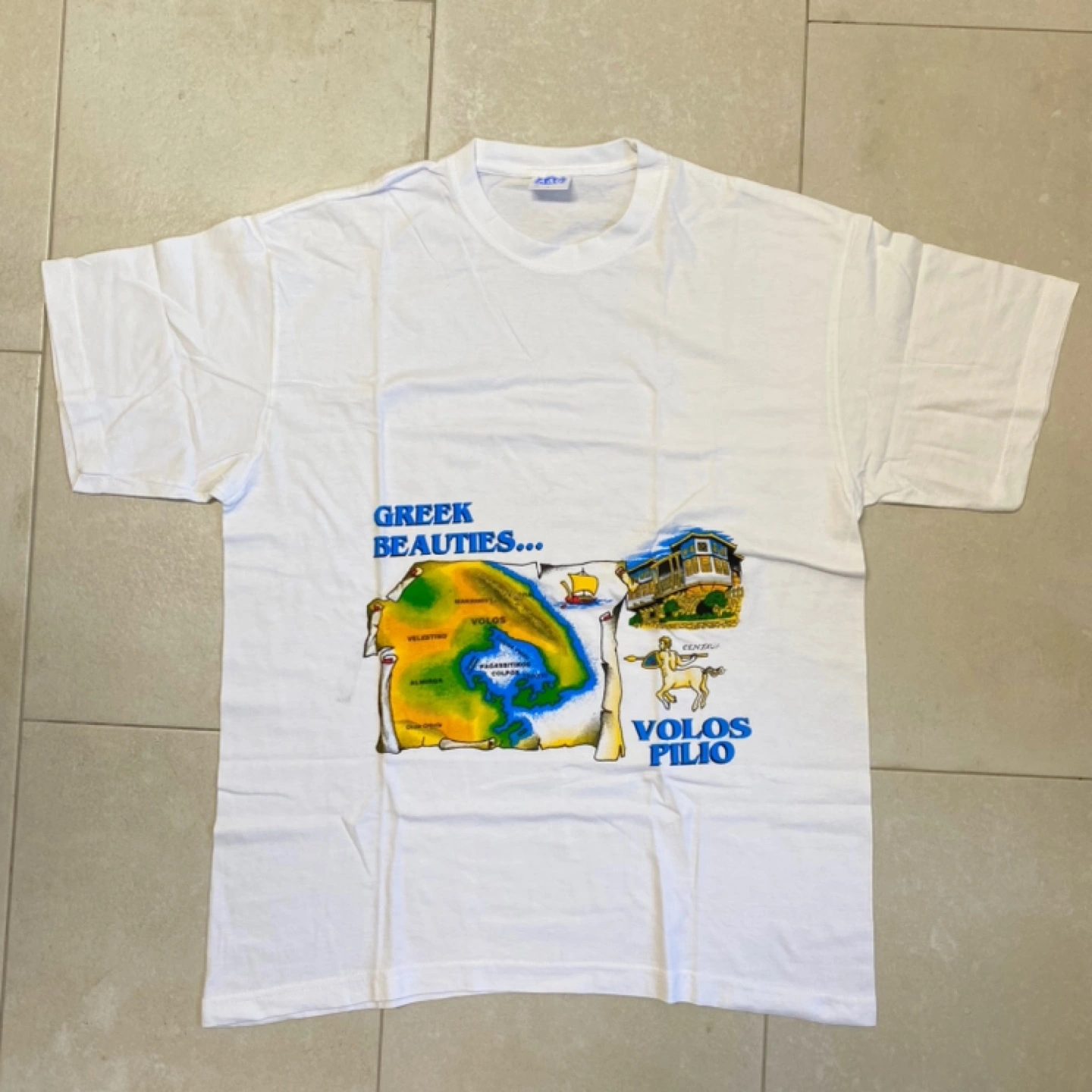 Here's a white graphic tee from A&G! It features a cool design with "Greek Beauties..." and "Volos Pilio" printed on the front. The size is L and the material is 100% cotton