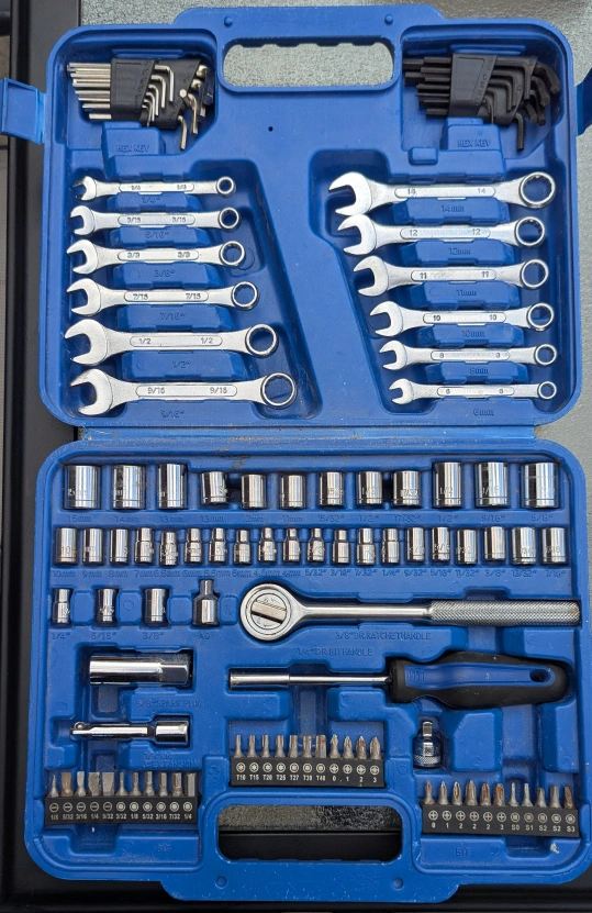 Selling a Hyper Tough 113-piece mechanics tool set. This set includes a variety of tools, perfect for any DIY project or repair job. The set comes in a sturdy blue case to keep everything organized and easy to transport. It includes a mix of SAE and metric sockets, wrenches, and screwdriver bits. Get everything you need in one convenient kit!