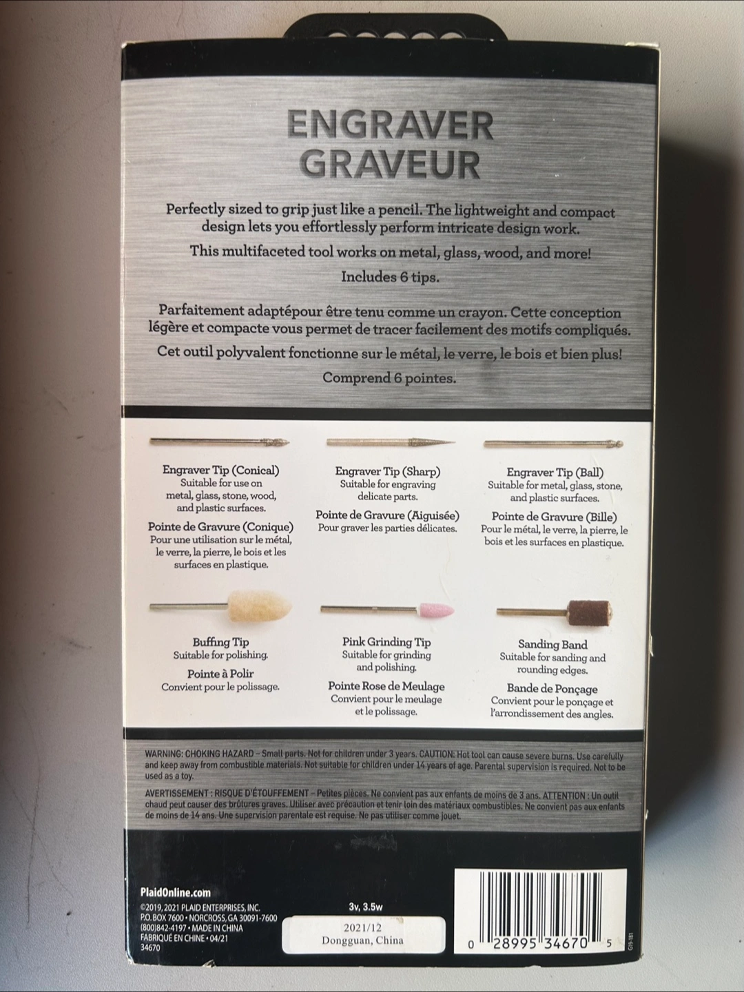I'm selling a brand new never used Plaid Engraver. It's perfectly sized to grip just like a pencil, making intricate design work effortless. This lightweight and compact design tool works on metal, glass, wood, and more! The kit contains: engraving tool, 6 interchangeable tips, 2 AA batteries, storage case, and an instruction sheet