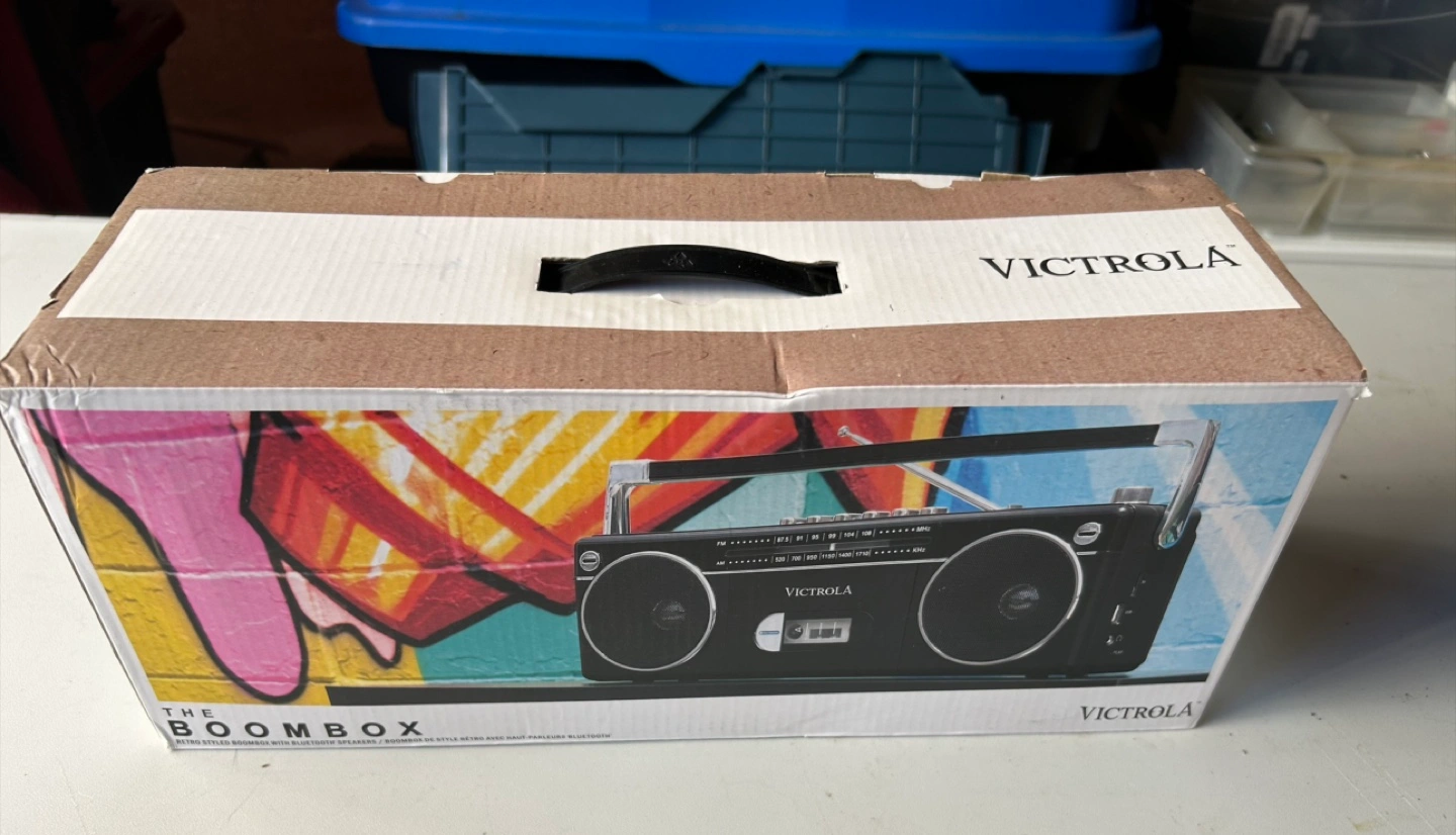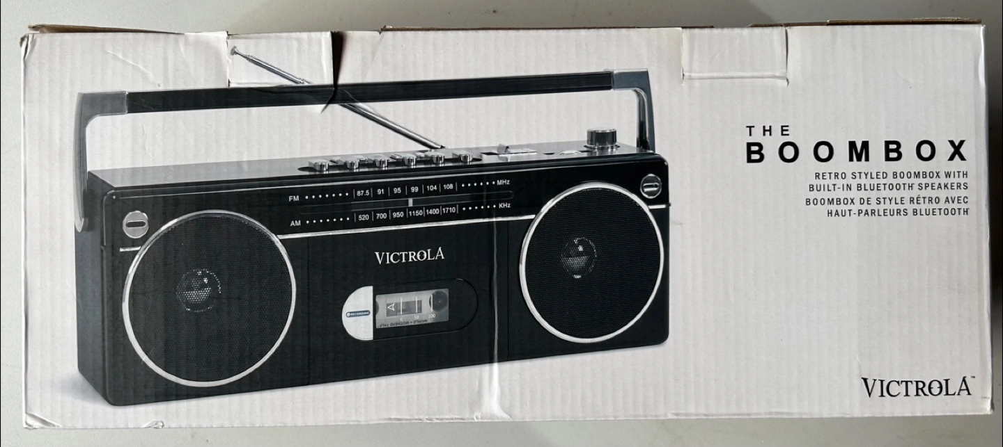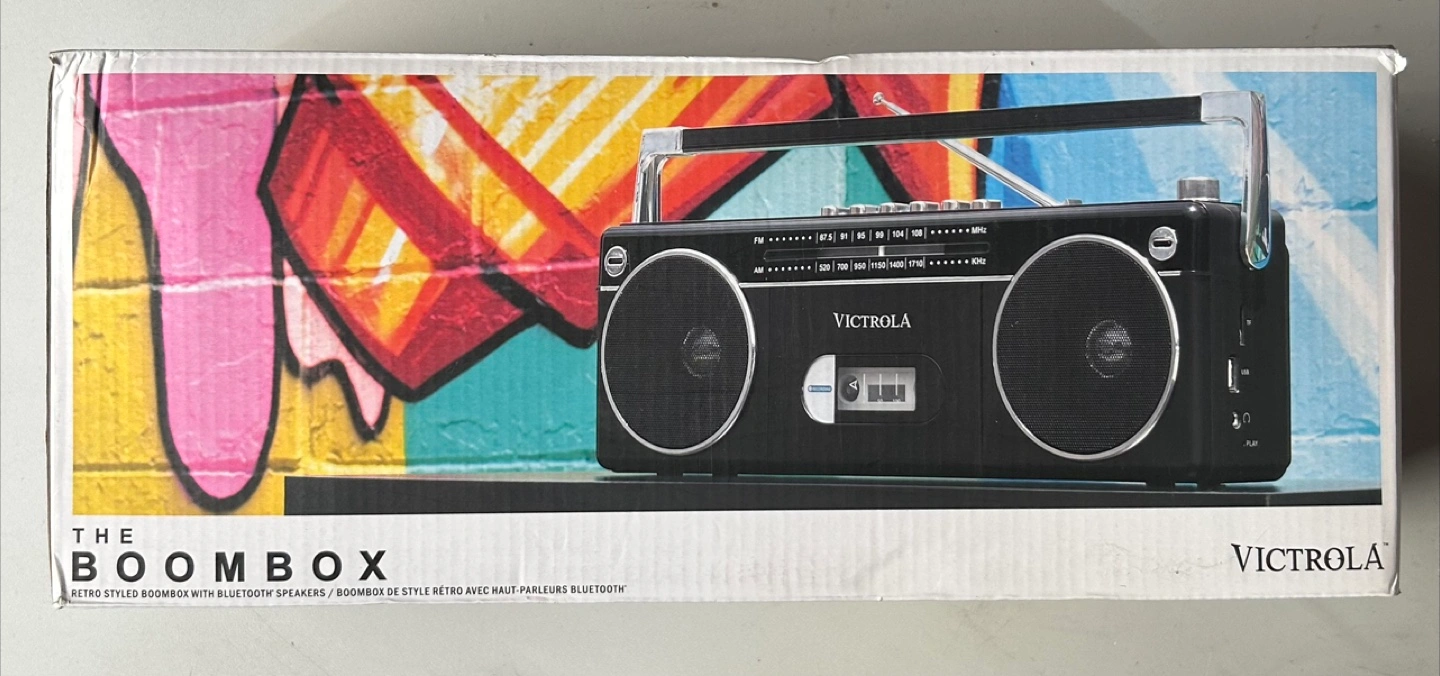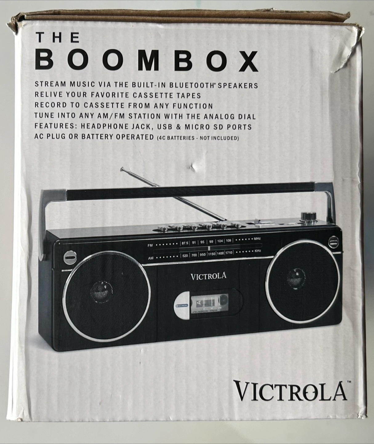 Selling a brand new reproduction with added modern technology like Bluetooth Victrola The Boombox! This retro-styled boombox comes with built-in Bluetooth speakers, so you can stream music wirelessly. It also plays cassette tapes and tunes into AM/FM radio stations. Features a headphone jack, USB, and Micro SD ports. It's AC plug or battery operated Price is the lowest I can go. ๐