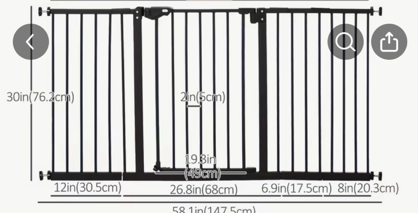 Keep your furry friends safe with this black metal safety gate! It's in great shape (barely used) and ready to install. The gate measures 30 inches (76.2 cm) in height and has an adjustable width to fit various doorways or staircases. It also features a convenient walk-through design. Asking $50.