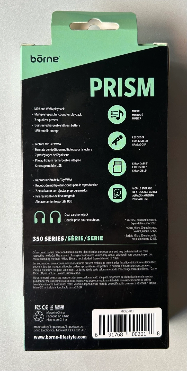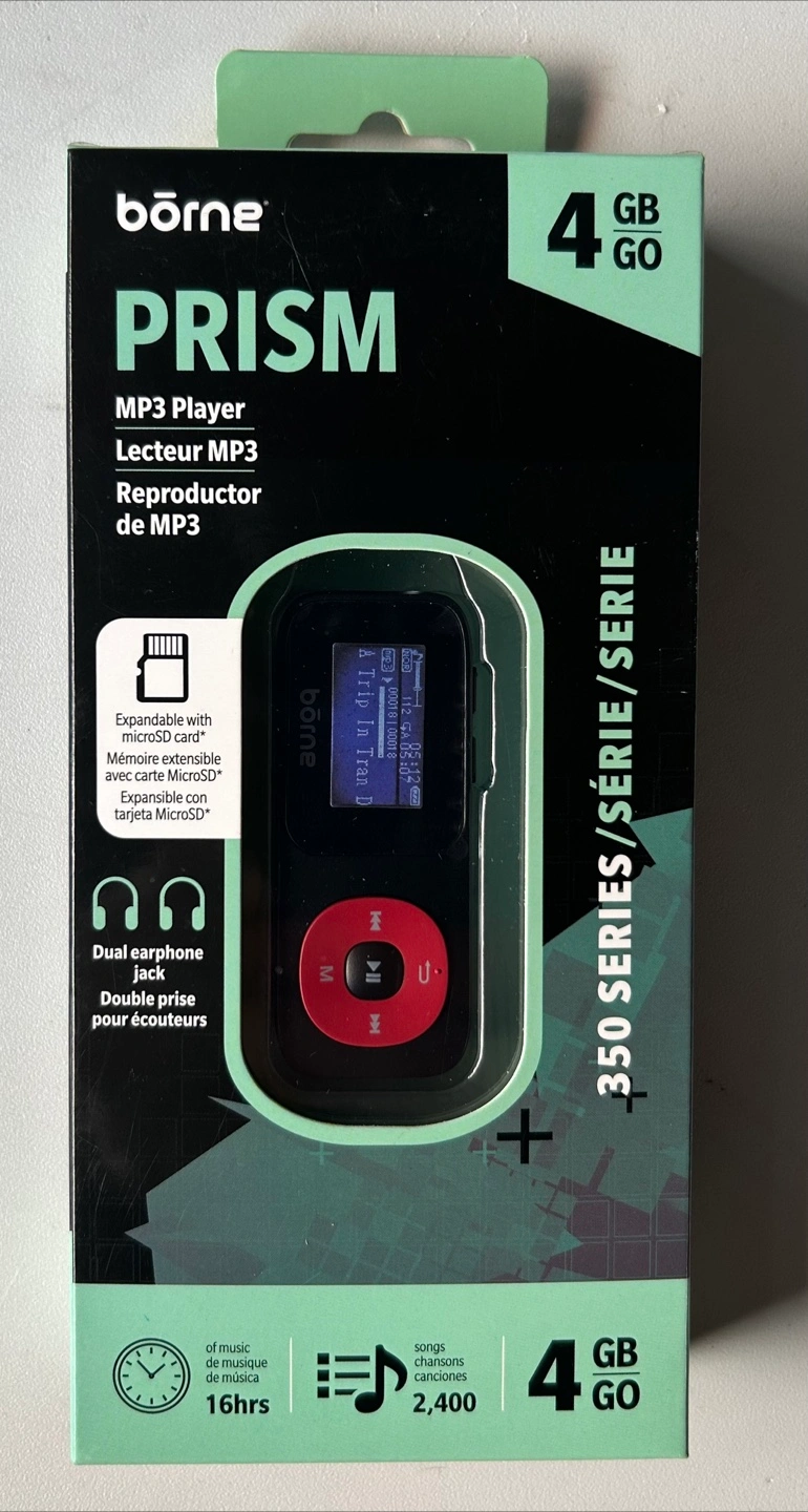Selling a Brand New Borne Prism MP3 player with 4GB of storage! It comes with earphones and is PC compatible. It features MP3 and WMA playback, multiple repeat functions, and 7 equalizer presets. Also has a built-in rechargeable lithium battery and USB mobile storage. Price is Firm #001PL