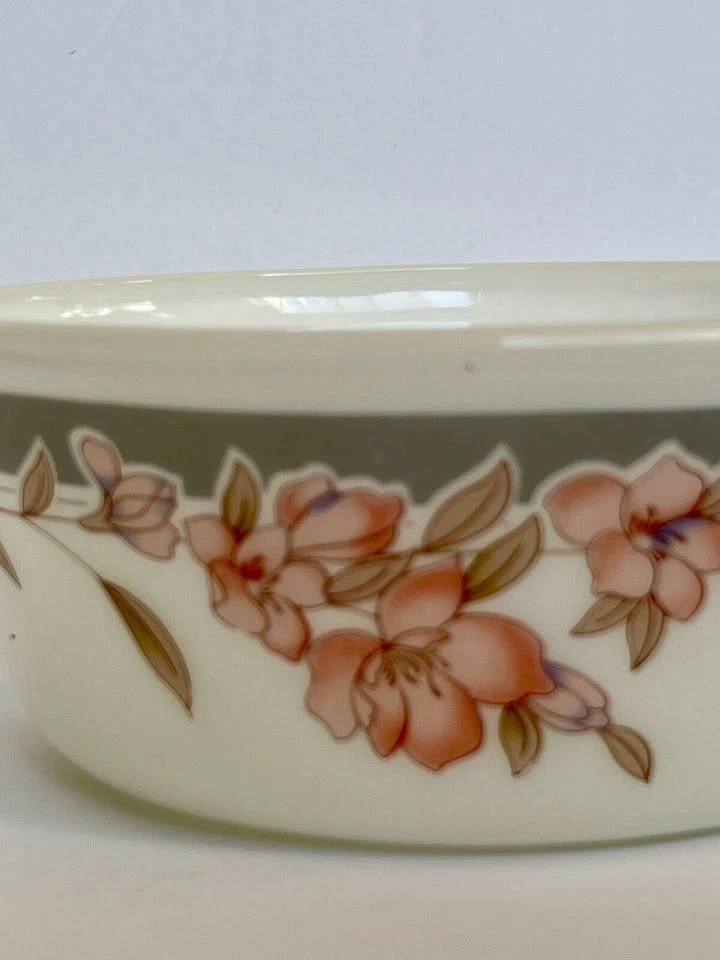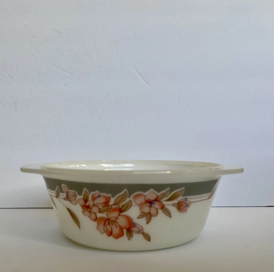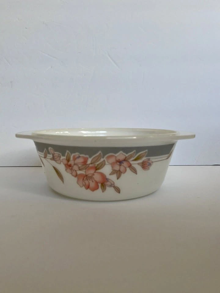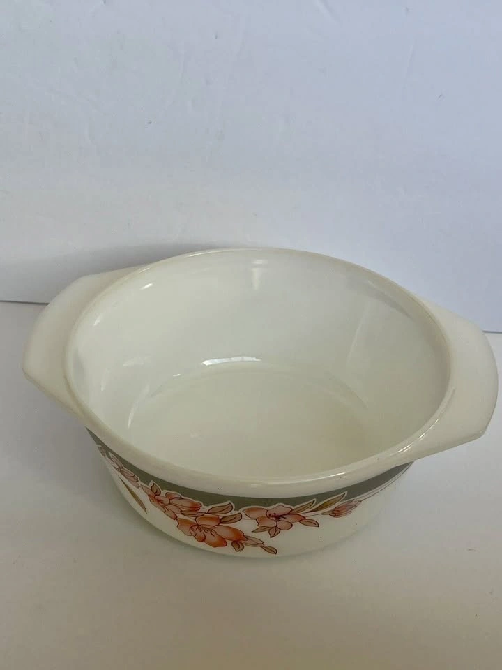 21This vintage Indopal milk glass cookware is a beautiful addition to any kitchen. Made in Indonesia, this pink Iris bowl is both durable and break-resistant, making it perfect for everyday use. The pressed milk glass production technique gives it a unique texture and the brand's signature backstamp adds a touch of authenticity. This bowl is part of the Indopal product line and is a rare find for collectors of vintage Pyrex. It features a lovely pink hue and intricate iris pattern that will surely add a pop of colour to your table.