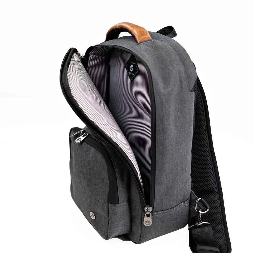 Fully recycled cross-body 14" laptop bag. Separate padded laptop pocket, built-in organization, adjustable shoulder, weatherproof materials. Vegan leather accents, recycled striped interior lining, lockable zippers, hidden security/passport pocket, key clip, and trolley strap.