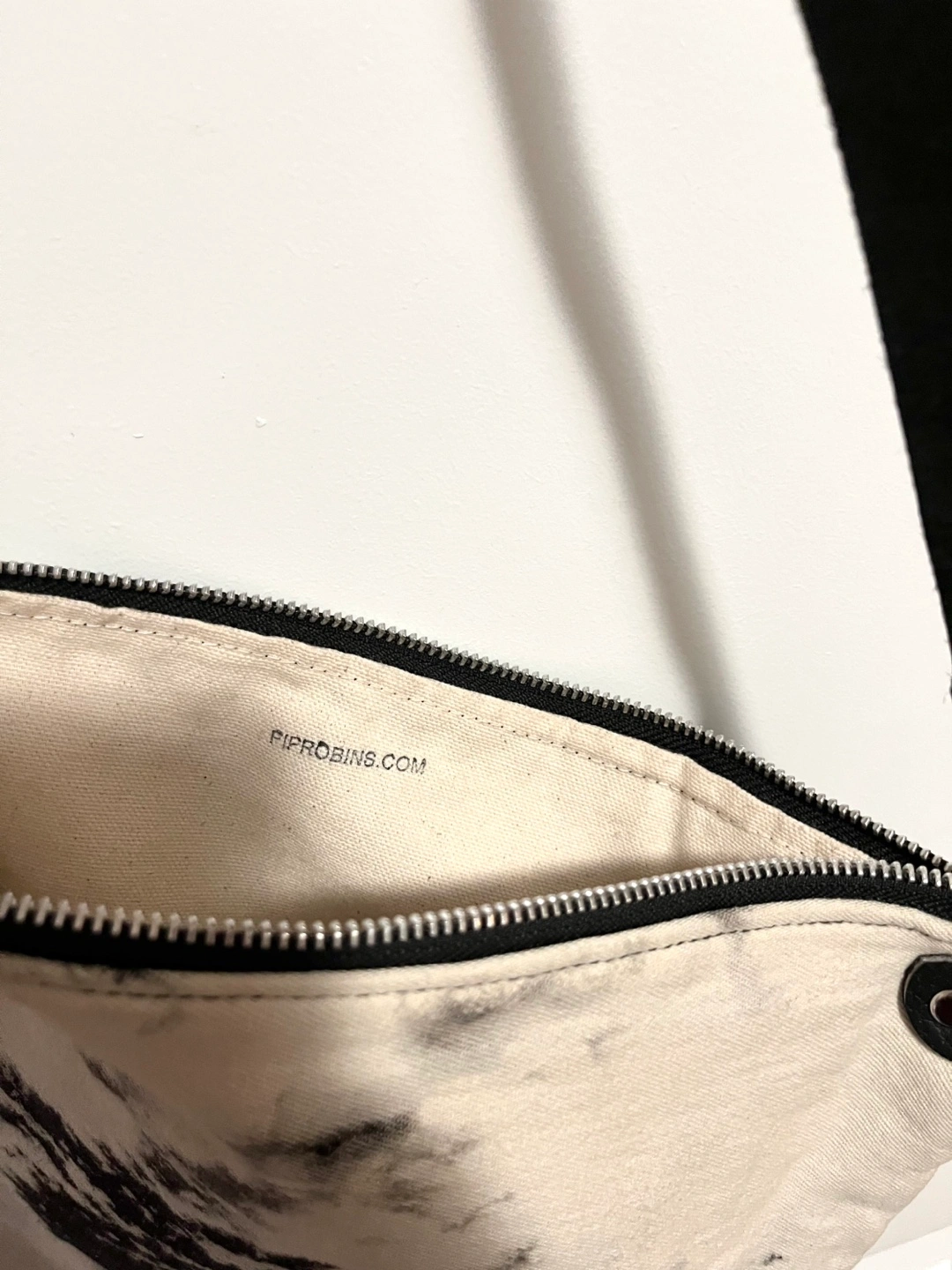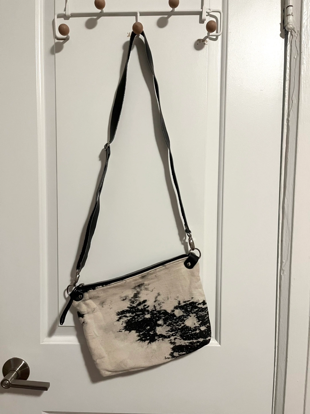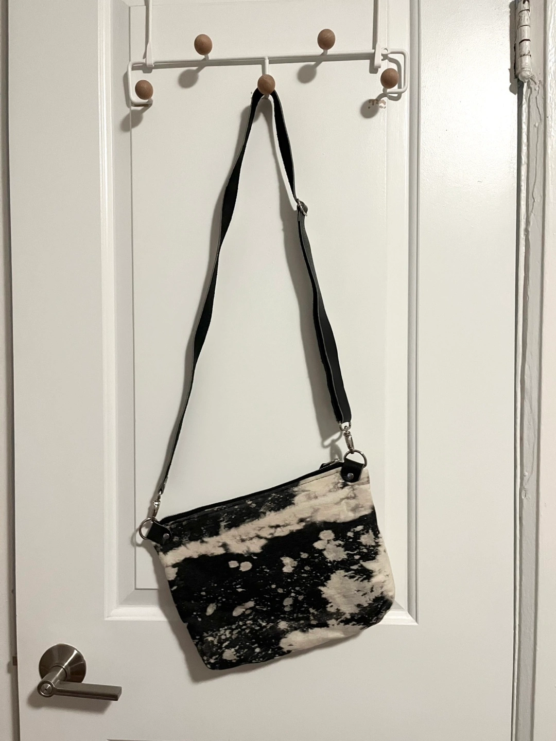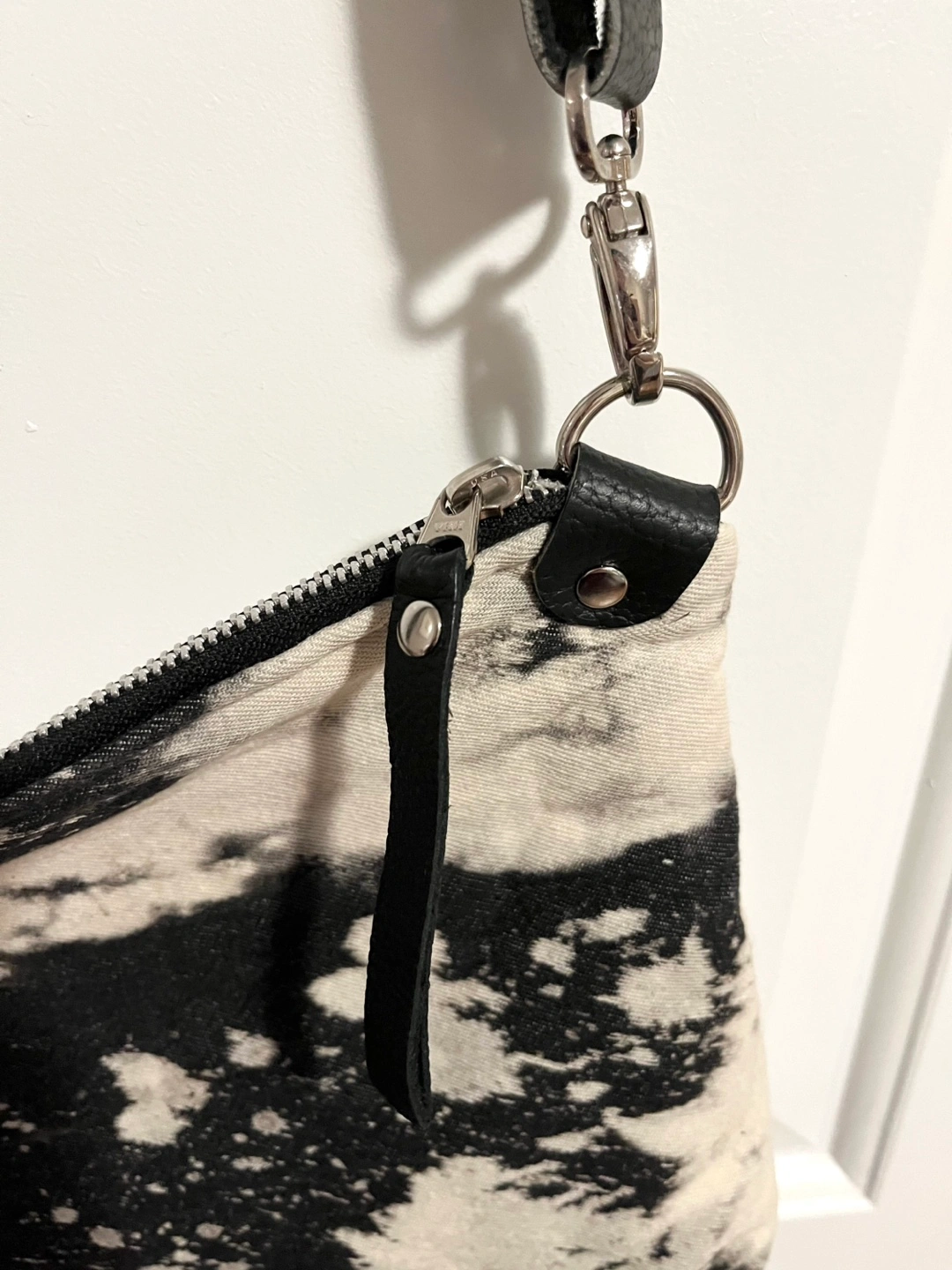 From local designer Pip Robins Bleached denim with leather strap Purse size: 12x9 in Strap 50in long Cash and carry Trinity Bellwoods / Yorkville / annex