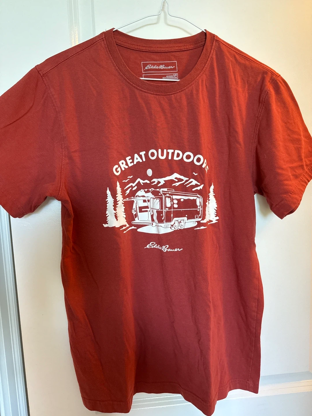 Cozy Eddie Bauer tee featuring a 'Great Outdoors' graphic! It's a size small and in a lovely reddish-brown colour. Perfect for casual wear or your next camping trip!